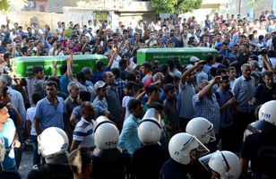 Fjöldaútför í Suruc fyrir fórnarlömb sprengjuárásar 32 létu lífið í árásinni í tyrkneska landamærabænum í gær, flestir háskólanemar. 21. júlí 2015 22:41
