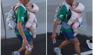 Mátti ekki hlaupa maraþonhlaup með barnið sitt á sér Hlaupari sem sást hlaupa með ungbarn í Hong Kong-maraþoninu var stöðvaður og beðinn um að yfirgefa svæðið. Honum var meinað að klára hlaupið. Sport
