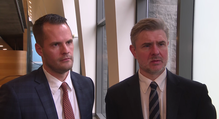 Lögmenn fagna sigri Grétar Dór Sigurðsson, lögmaður sem flutti Vaxtamálið svokallaða fyrir Hæstarétti og Ingvi Hrafn Óskarsson, sem flutti málið á öðrum dómstigum, ræða niðurstöðu málsins. Fréttir