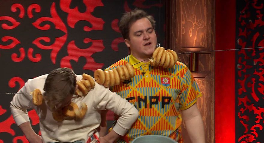 Safna kleinuhringjum með höfðinu Í síðasta þætti af Taskmaster fengu keppendur heldur skrautlegt verkefni og var það að safna saman kleinuhringjum. Eina reglan var að það var ekki í boði að nota hendur. Taskmaster
