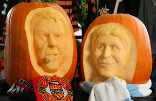 Skar út graskersmyndir af stjórum Manchester-liðanna Það er mikil spenna fyrir Manchester-slagnum í enska boltanum um helgina og stuðningsmaður Man. Utd hitar upp fyrir leikinn á afar sérstakan hátt. Enski boltinn 31.10.2014 23:15