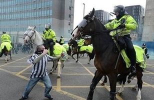 Barði hest í hausinn Stuðningsmenn Newcastle voru allt annað en sáttir eftir 3-0 tap sinna manna gegn Sunderland á Englandi í gær. Svo fór að lögregla þurfti að handtaka 29 þeirra að leik loknum. Enski boltinn 15.4.2013 09:45