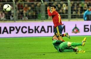 Pedro skoraði þrjú og lagði upp það fjórða í sigri Spánverja Heims- og Evrópumeistarar Spánverja unnu 4-0 útisigur á Hvíta-Rússlandi í undankeppni heimsmeistaramótsins í kvöld. Pedro, leikmaður Barcelona, átti ógleymanlegt kvöld en hann skoraði sína fyrstu þrennu í meistaraflokki í knattspyrnu. Fótbolti 12.10.2012 22:11