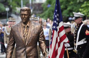 Reagan stytta afhjúpuð í London Stytta af Ronald Reagan, fyrrum forseta Bandaríkjanna, var í morgun afhjúpuð í London. Styttan er rúmir þrír metrar á hæð og stendur hún fyrir utan bandaríska sendiráðið þar í borg. Í ár eru 100 ár liðin frá fæðingu Reagans en styttan er afhjúpuð á þjóðhátíðardegi Bandaríkjanna, fjórða júlí. Fyrirmenni mættu til athafnarinnar, þar á meðal ráðherrarnir fyrrverandi William Hague og Condoleeza Rice. Erlent 4.7.2011 11:04