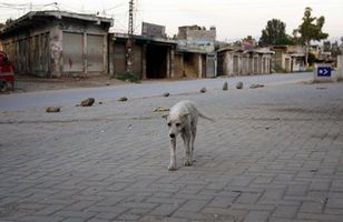 Hvar er allt fólkið? Einmana hundur röltir um götur hérðshöfuðborgarinnar Buner í Pakistan. Íbúarnir hafa flúið átökin sem þar geisa milli stjórnarhersins og talibana. Erlent 14.5.2009 16:40