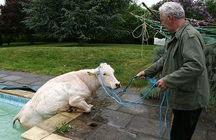 Bresk hjón fundu kú í sundlauginni Hjónum í bænum Whaddon á Suður-Englandi var brugðið þegar þau heyrðu eitthvað stórt falla ofan í sundlaugina í garði sínum. Enn meira brá þeim þegar þau þustu út í garð og fundu kú svamlandi um í sundlauginni. Erlent 14.5.2009 08:40