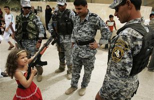 Barbie hvað? Leikföng barna eru margvísleg. Og litast af umhverfinu. Þessi litla stúlka í Írak leikur sér með það sem hún kannski sér mest. Leikfangaútgáfu af hríðskotariffli. Erlent 1.10.2008 17:44