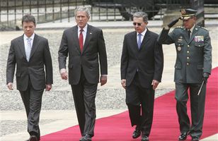 Bush lofar Kólumbíu stuðningi George Bush Bandaríkjaforseti lofar Kólumbíu meiri efnahagsaðstoð og viðskiptasamningum og lýsir yfir stuðningi við Alvaro Uribe forseta landsins. Bush er nú á ferðalagi um Suður-Ameríku og er nú í Kólumbíu. Bush lofaði Uribe og stjórn hans fyrir árangur í baráttunni gegn eiturlyfjabarónum og uppreisnarmönnum. Erlent 12.3.2007 07:08