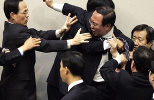 Þingið logaði í slagsmálum Slagsmál brutust út á suður-kóreska þinginu í vikunni þegar frumvarp um opnun hrísgrjónamarkaðar landsins var samþykkt. Þingmenn lítils stjórnarandstöðuflokks reyndu að hertaka forsetasætið í þingsalnum en þingmenn stjórnarflokkanna komu í veg fyrir það. Erlent 25.11.2005 04:00