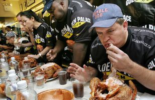 Tvö kíló af kjöti á tólf mínútum Bandaríkjamenn neyta jafnan ómælds magns af kalkúnakjöti á þessum árstíma er þakkargjörðarhátíðin svonefnda er haldin. Í þessu samfélagi samkeppninnar vilja menn vitanlega vita hver geti borðað hraðast og mest af hinu ljúffenga kjöti. Erlent 25.11.2005 05:15