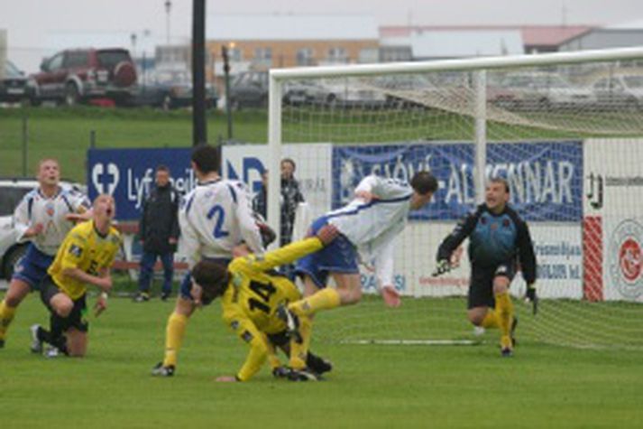 Það má með sanni segja að ungverski markvörðurinn Sandor Matus hafi verið þyngdar sinnar virði í gúllasi fyrir KA-menn í gærkvöld en hann tryggði þeim sæti í undanúrslitum VISA-bikarsins nánast upp á eigin spýtur eftir viðureign við Eyjamenn á Akureyrarvelli í kvöld. Staðan var markalaus eftir venjulegan leiktíma og framlengingu og því þurfti að grípa til vítaspyrnukeppni. Þá tók Matus til sinna ráða og varði allar þrjár vítaspyrnur Eyjamanna í vítakeppninni. Á sama tíma tíma skoruðu KA-menn úr öllum þremur spyrnum sínum og tryggðu sér þar með sæti í undanúrslitum bikarsins fjórða árið í röð. KA-menn voru mun sterkari aðilinn í leiknum allt þar til á 75. mínútu þegar Dean Martin fékk rauða spjaldið fyrir brot á Bjarnólfi Lárussyni. Allt annað var að sjá til liðsins heldur en í síðustu leikjum en leikurinn jafnaðist nokkuð eftir að Martin var farinn af velli. Gunnar Heiðar Þorvaldsson og KA-maðurinn Jóhann Þórhallsson fengu báðir tækifæri til að skora fyrir sín lið en bestu menn liðanna, markverðirnir Sandor Matus og Birkir Kristinsson, sáu við þeim eins og öðrum leikmönnum liðanna í gærkvöld. „Vítaspyrnukeppnir eru alltaf erfiðar. Þegar út í þær er komið þá er jafnt á komið með sóknarmönnum og markmönnum. Í dag hafði ég betur. Liðið er búið að spila illa í deildinni en vel í bikarnum og vonandi hjálpar þessi leikur okkur gegn Skagamönnum í deildinni á sunnudaginn,“ sagði Sandor Matus, hin ungverska hetja KA-manna, eftir leikinn. KA-ÍBV 0-0 (3-0 í vítakeppni)Vítakeppnin: Atli Sveinn Þórarinsson KA 1–0 Gunnar Heiðar Þorvaldssson ÍBV - varið Örlygur Þór Helgason KA 2–0 Matt Garner ÍBV - varið Jóhann Helgason KA 3–0 Ian Jeffs ÍBV - varið Dómarinn Magnús Þórisson Góður Bestur á vellinum Sandor Matus KA Tölfræðin Skot (á mark) 12–7 (5–3) Horn 11–2 Aukaspyrnur fengnar 17–14 Rangstöður 1–2 Frábærir Sandor Matus KA Mjög góðir Birkir Kristinsson ÍBV Góðir Atli Sveinn Þórarinsson KA Roinni Hartvig KA Hreinn Hringsson KA Örlygur Þór Helgason KA Tryggvi Bjarnason ÍBV Bjarnólfur Lártusson ÍBV Páll Hjarðar ÍBV Gunnar Heiðar Þorvaldsson ÍBV