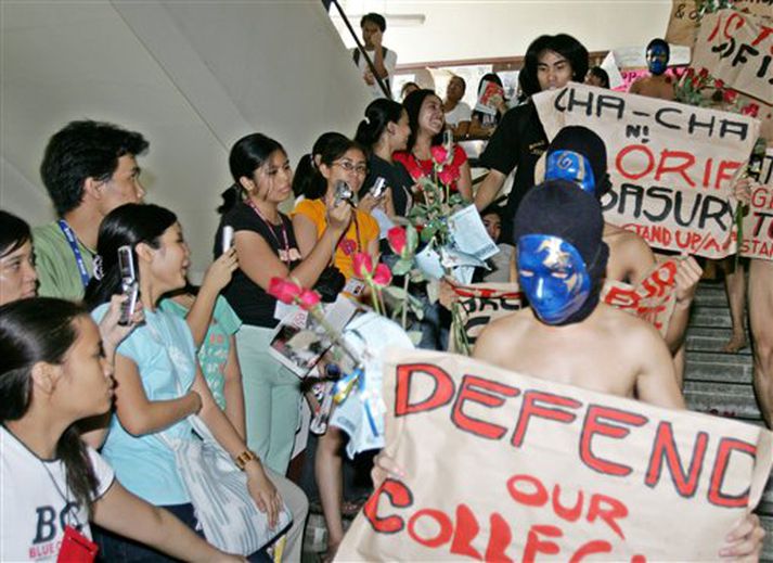 Stúdentar við Háskóla Filippseyja í Maníla söfnuðust saman í morgun til að berja nakta skólafélaga augum en liðlega þrjátíu manns tóku þátt í árlegu nektarhlaupi skólans um háskólasvæðið. Það er bræðralag í skólanum sem stendur fyrir hlaupinu og þar getur hver sem er verið með en í þetta sinn voru það einungis skólapiltar sem hlupu naktir. Stúdentarnir notuðu jafnframt tækifærið til að mótmæla hækkun skólagjalda og áformum filippseyska þingsins um að breyta stjórnarskránni. Fjölmargar stúdínur nýttu sér hlaupið og tóku myndir af skólabræðrum sínum á adamsklæðunum eins og þessi mynd ber með sér.