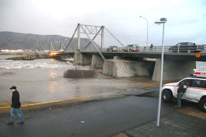 Vatnshæð stígur enn í Ölfusá 21. desember 2006 10:28 Selfossbrú kl 12 á hádegi MYND/Soffía Sigurðardóttir Vatn er byrjað að flæða inn í kjallara Selfosskirkju enda hefur ekkert lækkað í Ölfusá og mælist rennslið nú 2.100 á sekúndu. Að sögn Garðars Einarssonar kirkjuvarðar hefur aðeins flætt lítillega í kjallarann og hefur dæla sem komið var fyrir í kjallaranum undan að dæla vatninu. Garðar segir að sér sýnist sem enn sé að hækka í ánni, alla vega fari vatnsyfirborðið ekki lækkandi. Ef það hækki frekar í ánni þurfi væntanlega fleiri dælur til að dæla upp úr kjallaranum. Öllum munum sem voru í kjallara kirkjunnar var forðað burt í gær og því ekki hætta á þeir skemmist. Almannavarnanefnd situr nú á fundi á Selfossi þar sem farið er yfir stöðuna.Vatnið nær að TryggvaskálaSelfossbrú kl 12 á hádegiMYND/Soffía SigurðardóttirAðeins vantaði um 10 cm upp á að vatn næði að dyrum bílastæðahúss verslunarmiðstöðvarinnar Kjarnans.Rennsli í ánni var yfir 2100 rúmmetrum og hafði vaxið jafnt og þétt síðan í gær. Líklega er þarna að skila sér niður toppur sem mældist við Fremstaver, nokkuru ofan við Gullfoss, kl 8 í gærmorgun. Annar jafnstór toppur var við Fremstaver kl 16 í gær og því verður áin væntanlega í miklum ham í allan dag og fram á næstu nótt.Björgunarfélag Árborgar fór með bát upp á Skeið rétt fyrir hádegi til að bjarga hrossum sem þar voru orðin umflotin. Þá vann sveitin að því í nótt að aðstoða bónda við að flytja fé á milli húsa, þar sem farið var að flæða inn í fjárhúsið. Mest lesið Stigmögnun í nágrannaerjum: „Hann vildi keyra á mig“ Innlent Gengst nú við skilaboðunum umdeildu Innlent Hægt að nálgast vottorð um að makinn hafi rangt fyrir sér Innlent „Það átti að taka mig í karphúsið“ Innlent Selenskí undir miklum þrýstingi Innlent „Einhver SA prins mættur til að láta sem allt sé bara kózý“ Innlent Trump fer í fýlu og dregur boð sitt til Carney til baka Erlent Játaði meira og meira eftir því sem á leið Innlent Ólympíufarinn eftirlýsti gómaður eftir áratug á flótta Erlent Eldur í sendibíl á Miklubraut Innlent Fleiri fréttir Stigmögnun í nágrannaerjum: „Hann vildi keyra á mig“ Gengst nú við skilaboðunum umdeildu Hægt að nálgast vottorð um að makinn hafi rangt fyrir sér Um 900 manns nú með lögheimili í Grindavík „Það átti að taka mig í karphúsið“ Selenskí undir miklum þrýstingi Tímamótaviðræður hafnar og ögurstund hjá Samfylkingunni Eldur í sendibíl á Miklubraut Arnar Grétarsson í stjórnmálin Gjörbreytt Langahlíð fyrir milljarð Segist ekki muna eftir að hafa sent skilaboðin „Einhver SA prins mættur til að láta sem allt sé bara kózý“ Endurtekin og alvarleg mál valda áhyggjum Hiti færist í leikinn: „Frægur karl með enga reynslu“ Samfylkingarmönnum í Reykjavík fjölgað um 72 prósent Heimilisofbeldismálin alvarlegri en áður og fundað um Úkraínu í Abu Dhabi Svona var Pallborðið með Heiðu Björgu og Pétri Játaði meira og meira eftir því sem á leið Fann innbrotsþjófinn sofandi á heimilinu Nú geta íbúar skráð sjálfir hvað megi betur fara í borginni „Þetta er svolítið óvenjulegt, ég er ekki á þingi“ Landsleikir á vinnutíma fela í sér tækifæri Pétur vill leiða Viðreisn í Kópavogi Kom ekki á teppið Landsvirkjun hyggst bjóða út alla verkþætti Hvammsvirkjunar í ár Lilja sækist eftir því að leiða Framsókn Willum fer ekki fram og styður Lilju Foreldrarnir vissu ekki af kynferðisofbeldinu Magnea vill hækka sig um sæti Vissu ekki af kynferðisbrotinu fyrr en lögreglan hafði samband Sjá meira