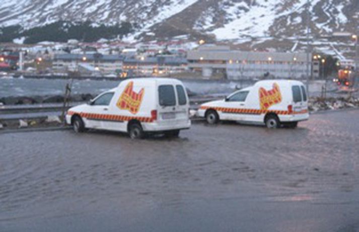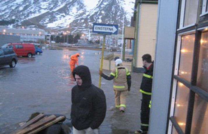 Sjór flaut yfir stóran hluta Eyrarinnar á Ísafirði í dag. Slökkvilið og bæjarstarfsmenn áttu í fullu fangi með að dæla vatni upp úr kjöllurum húsa og af götum bæjarins. Ekki liggur fyrir hversu mikið tjón varð vegna þessa en það þó ekki talið mikið. Dælingu úr kjöllurum er lokið.