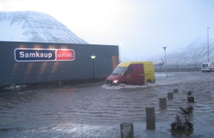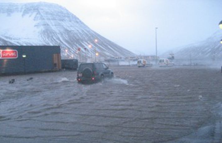 Ísfirðingar fóru ekki varhluta af því að illviðri gekk yfir landið í nótt og í dag. Mjög hvasst var í bænum í nótt og í morgun og þegar við bættist stórstraumsflóð, sem hafði áhrif á frárennsliskerfi bæjarins, æddi sjórinn yfir götur á eyrinni þannig að þær líktust frekar fljótum en götum.