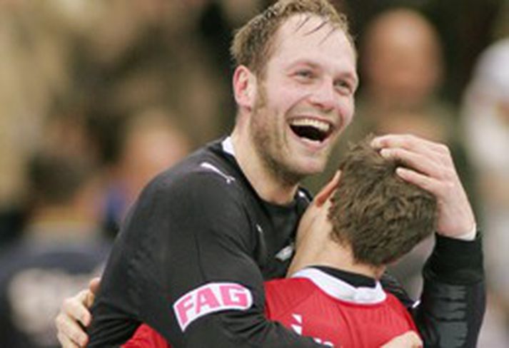Mundi ekki eftir framlengingunni 30. janúar 2007 23:11 Kasper Hvidt fagnar sigrinum með Lars Jorgensen AFP Markvörðurinn sterki Kasper Hvidt var bæði raunsær og afar glaður eftir sigurinn á Íslendingum. „Þetta var alveg frábært. Mann langar bara að fara á handahlaupum um salinn, þetta var svo mikil snilld", sagði Hvidt í samtali við TV2. „Það má segja að vörnin okkar hafi ráðið illa við sóknina hjá Íslendingunum, þeir áttu alltaf mótleik sama hvað við gerðum. Þessu verðum við að vinna í fyrir næsta leik. Við verðum að ná jafnvægi milli sóknar og varnar. Fyrst við erum komnir svona langt er engin leið að fara", sagði Hvidt að lokum.+ Félagi hans Lars Jorgensen var ekki alveg kominn niður á jörðina þegar fréttamaður TV2 náði tali af honum og sagðist muna frekar lítið hvað hefði gerst í framlengingunni. "Ég var nokkuð rólegur í venjulegum leiktíma, þrátt fyrir að vörnin okkar hafi verið skelfileg. Ég man síðan voðalega lítið eftir framlengingunni annað en það að Madsen skoraði sigurmarkið," sagði Jorgensen ánægður. Mest lesið Sjáðu geggjaðan snúning Alberts áður en hann skoraði frábært mark Fótbolti Bunting dró orð sín til baka með tárin í augunum: „Ég er ekki meistari fólksins“ Sport Sakaður um svindl á HM í pílukasti Sport Táningur fær mikið hrós fyrir viðbrögð sín þegar mótherji missti meðvitund Fótbolti Áhorfendur ærðust eftir mögulega mark mótsins í fyrsta leik Fótbolti Klappstýrur Björgvins Karls slógu í gegn Sport Óskar Hrafn um komu Arnórs Ingva: „Gífurlega dýrmætt fyrir KR“ Íslenski boltinn Stórstjarna úr WNBA-deildinni í heimsókn á Íslandi Körfubolti „Ef þið væruð Antoine Semenyo, hvert mynduð þið fara?“ Enski boltinn Guardiola mun vigta leikmenn Man City eftir jólin Enski boltinn Fleiri fréttir Haukur getur náð hundrað plús hundrað fyrir EM-fríið Rúnar sótti sinn fyrsta sigur sem þjálfari Wetzlar Haukur með sjö mörk og Magdeburg rétt marði botnliðið Rúmlega áttræður Moustafa endurkjörinn forseti IHF með yfirburðum Slæm fjárhagsstaða HSÍ kemur ekki niður á EM Donni fagnaði EM vali með skotsýningu Sigvaldi Björn fjarri góðu gamni í sjaldséðu tapi Kolstad Eva Björk með stórleik í fyrsta sigri Stjörnunnar „Hann er ein stærsta ástæðan fyrir því“ KA-menn fengu góða jólagjöf Flautumark hjá FH og ÍR með þeim í Höllina KA í undanúrslit á kostnað bikarmeistaranna Stærsti leikur ársins í Eyjum fer fram í kvöld „Er því miður kominn í jólafrí“ „Þetta var mjög skrítinn leikur“ Haukakonur í fjórða sætið KA/Þór - Valur 23-30 | Ótrúlegur viðsnúningur gestanna Ómar óstöðvandi og Magdeburg í undanúrslit Ómar Ingi fær meiri ábyrgð og tekur við kyndlinum af Aroni Ekkert stríð við Porto og einstakur Þorsteinn nítjándi maður Síðasta verkefni reyndist dýrt fyrir Sigvalda Teitur fer á EM sem hornamaður í stað Sigvalda Snorri kynnti EM-strákana okkar Hleyptu Þorsteini ekki heim og vilja ekki að hann fari á EM Kári og Logi vilja henda Ými út úr landsliðinu Sagður utan hóps fyrir Bjarka og Orra Geggjaðar Eyjakonur á toppinn Þorsteinn Leó að ná sér „langt á undan áætlun“ Birtu tölvupóst þar sem efast er um heilsu forseta IHF Valdi ekki eigin leikmann í landsliðið Sjá meira