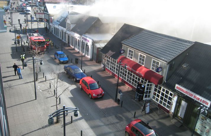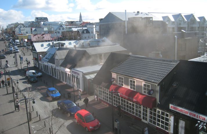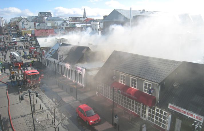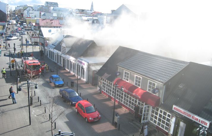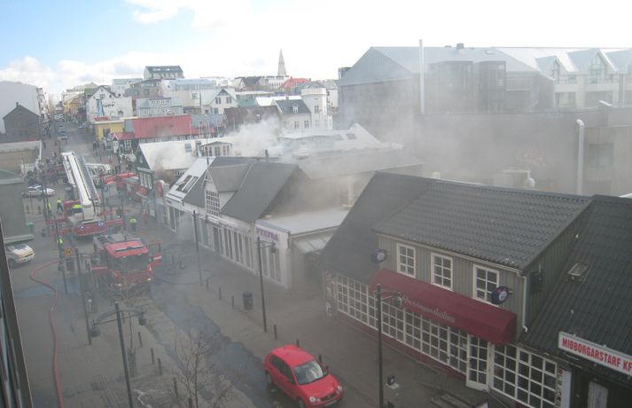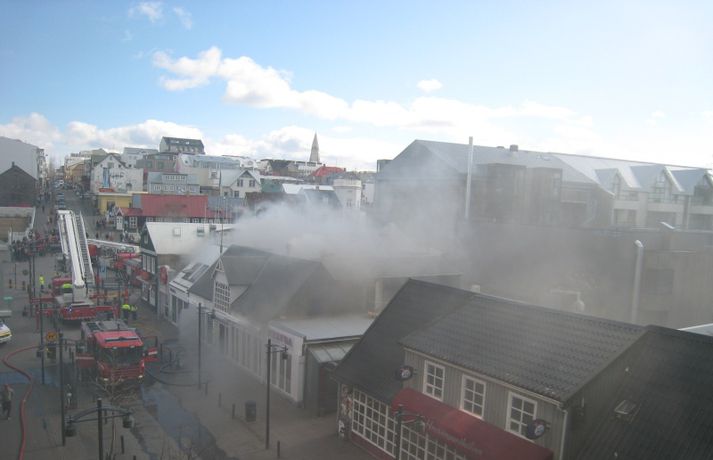 Voru eldsupptökin ekki í Fröken Reykjavík? 20. apríl 2007 18:26 Myndin sýnir menn á þaki Pravda kl um kl. 13:54 og reyk virðist leggja frá því húsi. Myndir sem birtar hafa verið á netinu gefa til kynna að eldurinn í húsasamstæðunni á horni Austurstrætis og Lækjargötu hafi hugsanlega ekki átt upptök sín í söluturninum Fröken Reykjavík eins og gefið hefur verið til kynna í fréttum. Myndirnar, sem voru teknar nokkrum mínútum fyrir klukkan tvö, eða rétt um það leyti sem tilkynnt var um eldinn, sýna að klukkan sex mínútur fyrir tvö eru menn komnir upp á þak veitingahússins Pravda. Þeir virðast vera að huga að eldinum. Fyrstu vísbendingar um upptök eldsins bentu til að hann hefði verið í loftljósi í Fröken Reykjavík. Tæknideild lögreglunnar rannsakaði brunastaðinn í gær og hefur verið að fara yfir gögn málsins í dag. Rannsókn stendur yfir og er íkveikja nú ekki útilokuð frekar en aðrar orsakir.Myndin tekin um kl 13:54Upplýsingar myndskrárinnar sjálfar sýna að myndin er tekin klukkan 13:53:57Nokkrar myndir af brunanum, sem birtar eru á vefsvæðinu foo.is og virðast hafa verið teknar af Baldri Gíslasyni, sýna að eldurinn hefur magnast á nokkrum mínútum. Fyrsti slökkviliðsbíllinn er svo kominn á staðinn klukkan 14:03 samkvæmt myndunum. Mest lesið Einn fluttur á sjúkrahús eftir bílslys Innlent Hvar er opið á aðfangadag? Innlent Kynnti drög að nýrri friðaráætlun Erlent Skiluðu hagnaði á kosningaári Innlent Fátækari eftir að hafa svindlað á ferðakonum Innlent Arion banki varar við svikaherferð Innlent Hátíðarveisla á kaffistofu Samhjálpar: „Það er ró og friður yfir fólki“ Innlent Tveir lögreglumenn sprengdir í loft upp Erlent Minni rekstrarkostnaður fyrir eigendur bensínháka Innlent Blússandi hagvöxtur í Bandaríkjunum Erlent Fleiri fréttir Gleðileg jól, kæru lesendur Einn fluttur á sjúkrahús eftir bílslys Skiluðu hagnaði á kosningaári Hátíðarveisla á kaffistofu Samhjálpar: „Það er ró og friður yfir fólki“ Björgunarsveitin kölluð út í fokverkefni Grjóthrun undir Eyjafjöllum Fátækari eftir að hafa svindlað á ferðakonum Arion banki varar við svikaherferð Innanlandsflugi aflýst Foreldrar skipverjans fá áheyrn í Hæstarétti Hvar er opið á aðfangadag? Innflytjendamálin almenningi efst í huga Bæta við allt að 200 íbúðum og mathöll í Spöngina Maður í umferðarslysi reyndist fíkniefnasali Minni rekstrarkostnaður fyrir eigendur bensínháka Hafnar „jólakveðju“ ríkisins Hefði þurft hjólbörur undir öll verðlaunin sín Ýmis ráð til taugatrekktra á Þorláksmessu Ekkert því til fyrirstöðu að Ásthildur Lóa verði aftur ráðherra Óvissa um ráðherraskipan og skata fyrir byrjendur Maðurinn fundinn Sigríður Halldórsdóttir nýr ritstjóri Kastljóss Íslendingur í gæsluvarðhaldi í Kólumbíu vegna gruns um kynferðisbrot Forsætisráðuneytið eyddi meiru í almannatengla í fyrra en í ár Inkalla snuð vegna of mikils magns BPA-plastefna Svanhildur Sif heiðruð Falskar netverslanir: Auglýsir rýmingarsölu nokkrum dögum eftir opnun Meðallaun upplýsingafulltrúa hækkuðu hlutfallslega mest Skötuilmurinn leggst yfir landið og Samkeppniseftirlitið ætlar að fylgjast vel með bensínverðinu Áfram auknar líkur á eldgosi Sjá meira