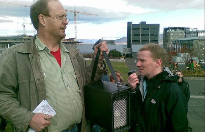 Talið er að á bilinu 300-500 manns hafi safnast saman nú í hádeginu á Arnarhóli þar sem boðað hafði verið til mótmæla. Þar var krafist afsagnar bankastjórnar Seðlabankans vegna þess öngstrætis sem peningamálastefna þjóðarinnar er komin í og þeirra hörmunga sem dynja á þjóðinni. Gjallarhorn var á staðnum og létu nokkrir í sér heyra á Arnarhóli áður en gengið var að Seðlabankanum og mótmælunum haldið áfram. Þá tók tónlistarmaðurinn KK lagið á mótmælunum. MYND/AntonMYND/Stöð 2MYND/Stöð 2MYND/AntonMYND/AntonMYND/Anton