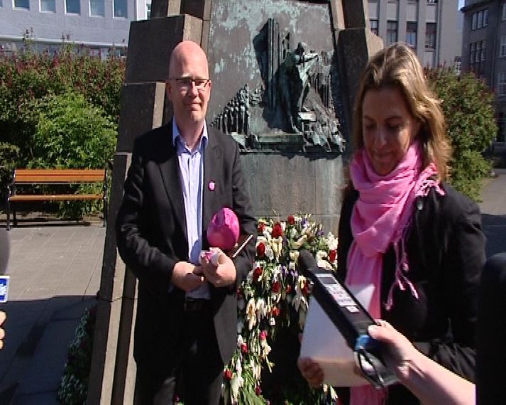 Kvenrréttindadagurinn er haldinn hátíðlegur um land allt í dag. Femínistafélag Íslands afhenti bleiku steinana við hátíðlega athöfn í morgun en í fyrsta skipti var móttöku þeirra hafnað. Kvenréttindadagurinn verður haldinn hátíðlegur um allt land í dag en þess er minnst að 94 ár eru síðan konur fengu kosningarétt hér á landi. Fjölmargir viðburðir verða haldnir í tengslum við daginn. Dagskráin hófst í morgun þegar utanríkisráðuneytið og Háskóli íslands undirrituðu viljayfirlýsingu um samstarf um stofnun Jafnréttisseturs og Jafnréttisskóla sem ráðgert er að koma á stofn í nóvember. Bleiku steinarnir voru afhentir á Austurvelli.MYND/Stöð 2 Meðlimir í Femínistafélagi Íslands afhentu bleiku steinanna við styttu Jóns Sigurðssonar á Austurvelli í morgun. Með þeim vill félagið minna á mikilvægi þess að hafa jafnréttissjónarmið í huga við ákvarðanatöku og hvetja handhafa steinanna til að kynna sér femínisma. Dómsmálaráðherra og yfirmaður kynferðisbrotadeildar ríkislögreglustjóra veittu steinunum viðtöku að þessu sinni en athygli vakti að forseti Hæstaréttar og og formaður dómarafélagsins afþökkuðu boð félagsins þar sem þeir vildu gæta hlutleysis. Þetta er í fyrsta sinn sem bleiku steinarnir eru afþakkaðir. Af fleiri viðburðum má nefna Bríetargönguna undir leiðsögn Auðar Styrkársdóttur, móttöku Kvenréttindafélags Íslands, Kvenfélagasambands Íslands og Bandalags kvenna í Reykjavík í samkomusal Hallveigarstaða og kvennamessu við þvottalaugarnar í Laugardal í kvöld þar sem Þórunn Sveinbjarnardóttir umhverfisráðherra predikar. Og á Akureyri verður haldið Norrænt þing kvenfélaga. Þingið verður sett klukkan eitt í dag og stendur það fram á sunnudag.