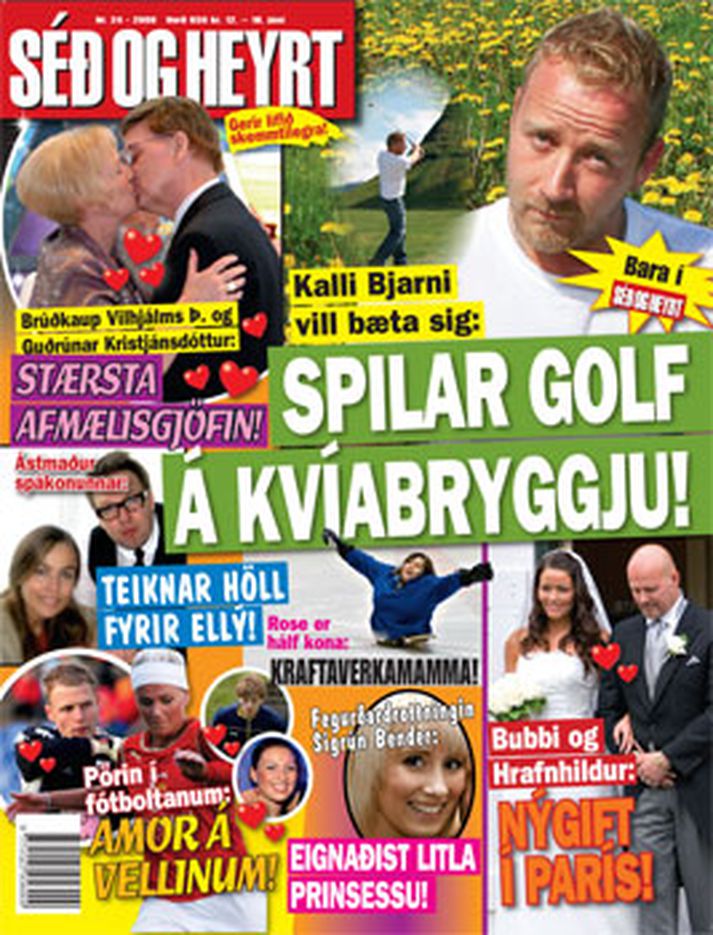 Fréttin um Idol-stjörnuna Kalla Bjarna sem spilar golf og skrifar barnabók á Kvíabryggju hefur vakið sterk viðbrögð almennings. Erlendur Baldursson hjá fangelsismálastofnun segir Kvíabryggju ekkert hótel þrátt fyrir golfvöll og ný rúm. "Þeir sem kalla fangelsi hótel vita ekki hvað þeir eru að tala um. Maður heyrir þetta stundum hjá fjölmiðlum en aldrei hjá ættingjum sem eiga einhvern nákominn í fangelsi," segir Erlendur. Kalli Bjarni afplánar tveggja ára fangelsisdóm sem hann fékk eftir að hafa flutt inn tæp tvö kíló af kókaíni. Í Séð og Heyrt kemur fram að hann afpláni á Kvíabryggju; lífið leiki við hann og hann noti frístundir sínar til að spila golf og skrifa barnabók. Forsíða Séð og Heyrt. Kalli Bjarni í golfi. Þá hefur vakið athygli hverjir fá að dvelja á Kvíabryggju og hverjir ekki. Til dæmis afplánaði handrukkarinn Annþór Kristján Karlsson eitt sinn hluta af dómi á Kvíabryggju. "Reglan er sú að menn sem vistast í opnum fangelsum verða að vera hæfir til þess og miðað er við að þeir dvelji ekki lengur en tvö ár á staðnum," segir Erlendur. Í Séð og Heyrt í dag er haldið áfram að fjalla um Kvíabryggju. Taldir eru upp frægir einstaklingar sem hafa afplánað á Kvíabryggju og komið út betri menn. Þar á meðal er Pétur Þór Gunnarsson, sem opnaði nýverið aftur Gallerí Borg, Ármann Reynisson sem í dag er frægur vinjettuhöfundur, Knútur Brún lögfræðingur sem varð formaður safnráðs Listasafns Íslands og ekki má gleyma Árna Johnsen sem gerði dvölina á Kvíabryggju að skapandi sumarstarfi. "Kvíabryggja rís undir nafni sem betrunarstofnun þar hafa fallin og fölnuð blóm sprungið út á ný. Allir eiga rétt á öðru tækifæri," segir Eiríkur Jónsson, ritstjóri Séð og Heyrt, í leiðara blaðsins í dag.