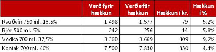 Áfengisverð mun ekki breytast á morgun, eftir því sem Sigrún Ósk Sigurðardóttir, aðstoðarforstjóri ÁTVR, segir í samtali við Vísi. Hækkun á áfengisgjaldi var samþykkt á Alþingi í kvöld og hækkar verð á léttvíni og bjór um nokkur prósent. Verð á sterku áfengi hækkar þó mest. Sé smellt á myndina hér að neðan má sjá hvernig hækkunin kemur út. Athygli vekur að lögin taka strax gildi. Sigrún segir að þrátt fyrir þetta breytist verð ekki á morgun. Alþingi samþykkti jafnframt í kvöld hækkun á bifreiðagjöldum og gjöldum af eldsneyti.