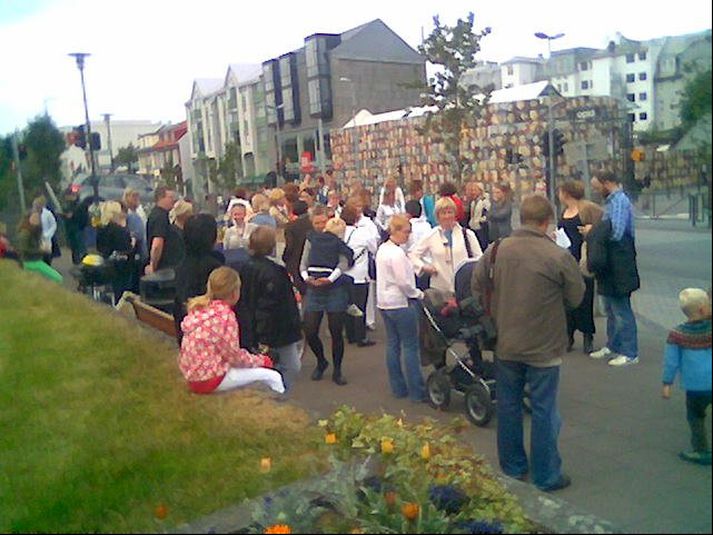 Talið er að um 50 manns séu saman komnir við Stjórnarrráðið við Lækjargötu. Þar er ætlunin að sýna Ljósmæðrafélagi Íslands samstöðu í samningaviðræðum við ríkið þegar ráðherrar mæta á ríkisstjórnarfund nú klukkan hálftíu. Ljósmæðrafélagið ákvað að skrifa ekki undir samning sem Bandalag háskólamanna gerði við ríkið á dögunum og var það vegna þess að samninganefnd ríkisins hafði ekki á neinn hátt komið til móts við kröfur ljósmæðra eftir því sem þær segja. Þær vilja að nám þeirra verði metið til jafns við aðrar stéttir með sambærileg laun. Fregnir hafa borist af því að hátt í hundrað ljósmæður hafi sagt upp störfum til að mótmæla kjörum sínum en fram kom í fréttum Stöðvar 2 á dögunum að lögfræðingar og verkfræðingar starfandi hjá hinu opinbera, með fimm ára háskólanám að baki, eru með að minnsta kosti hundrað þúsund krónum hærri laun en ljósmæður með sex ára háskólanám. Frá samstöðunni í morgun.MYND/Höskuldur Kári í áskorun sem afhent var forsætisráðherra við Stjórnarráðið í morgun kemur fram að kröfur ljósmæðra séu í fullu samræmi við stefnuyfirlýsingu ríkisstjórnarinnar, en í kaflanum um jafnrétti í reynd segi að endurmeta beri sérstaklega kjör kvenna hjá hinu opinbera, einkum þeirra stétta þar sem konur séu í miklum meirihluta. „Ljósmæður eru eingöngu konur og þær þjónusta eingöngu konur. Ríkisstjórn sem stefnir að jafnrétti í reynd getur ekki virt þarfir og störf kvenna að vettugi, heldur verður hún að beita sér í þágu stéttarinnar og fæðandi kvenna. Störf ljósmæðra eru ómetanleg. Þær styðja og þjónusta konur og börn þeirra á mikilvægustu augnablikum lífsins. Vísindin segja okkur í dag að tímabilið frá getnaði og út fyrsta lifiár einstaklings, er það mest heilsumótandi á ævinni. Hérlendis er eftirlit á meðgöngu, fæðingarhjálp og ungbarnavernd, nær eingöngu í næmum höndum ljósmæðra. Það er því ljóst að ljósmæður gegna lykilhlutverki í heilsueflingu þjóðarinnar og er allra hagur að svo verði áfram. Stuðningsfólk ljósmæðra skorar hér með á ríkisstjórnina að verða við kröfum ljósmæðra um að veita samninganefnd ríkisins umboð til að leiðrétta laun þeirra til samræmis við aðrar háskólastéttir með sambærilega menntun. Þannig getur hún stuðlað að jafnrétti í reynd og tryggt öryggi og líðan kvenna og barna um ókomin ár,“ segir í tilkynningunni.