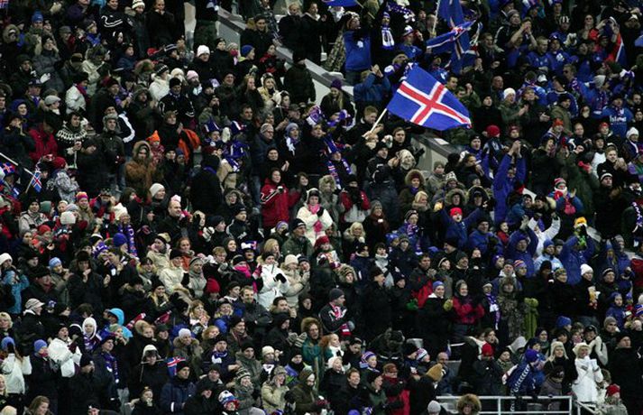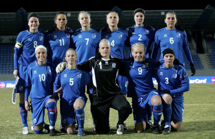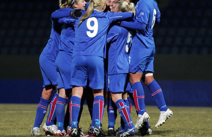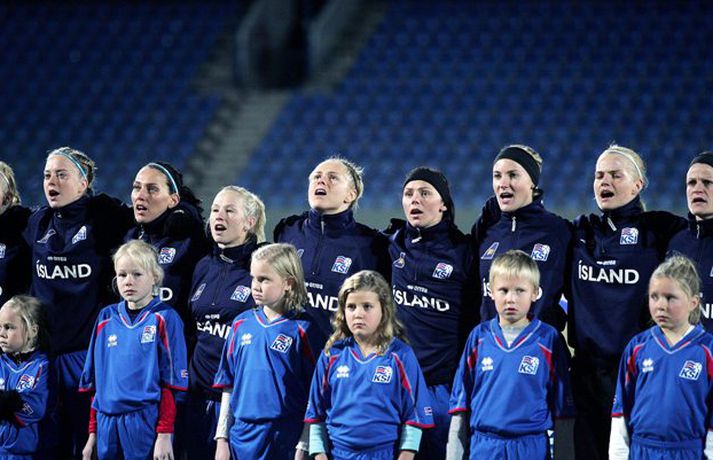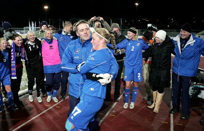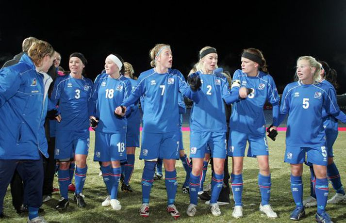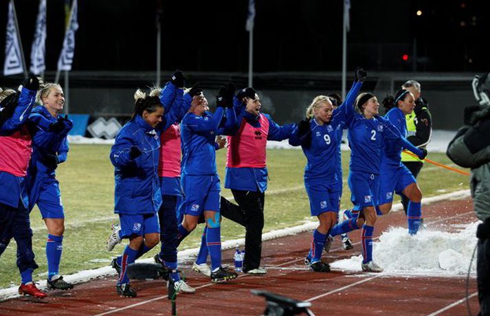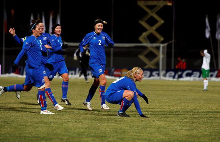 Ísland tryggði sér í kvöld sæti í úrslitakeppni Evrópumeistaramótsins sem fer fram í Finnlandi á næsta ári með 3-0 sigri á Írlandi á Laugardalsvelli í kvöld. Gríðarlega góð stemning var á leiknum og brutust út mikil fagnaðarlæti í leikslok þegar ljóst var að markmiðinu langþráða var náð. Íslenskt A-landslið í knattspyrnu hefur í fyrsta sinn tryggt sér sæti í úrslitakeppni stórmóts í knattspyrnu. Ljósmyndararnir Stefán Karlsson og Daníel Rúnarsson voru á vellinum í kvöld og má sjá myndasyrpu úr leiknum með því að smella á hlekkinn hér að neðan. Íslensku leikmennirnir tóku vel undir með þjóðsöngnum sem og áhorfendur á Laugardalsvelli í kvöld.DaníelByrjunarlið íslenska landsliðið sem vann 3-0 sigur á Írum í kvöld.DaníelDóra María Lárusdóttir skoraði tvö mörk í kvöld og lagði það þriðja upp. Hér er hún í baráttunni.DaníelÍslenska liðið fagnar fyrra marki Dóru Maríu.DaníelSara Björk Gunnarsdóttir í baráttunni.DaníelStuðningsmenn íslenska landsliðsins fjölmenntu á Laugardalsvöllinn í kvöld þrátt fyrir kuldann.DaníelÓlína Guðbjörg Viðarsdóttir átti góðan leik í kvöld sem og aðrir leikmenn íslenska liðsins.DaníelÞað er allt í lagi með þennan völl, gaf Margrét Lára Viðarsdóttir til kynna er hún fagnaði marki sínu í kvöld. StefánHólmfríður Magnúsdóttir þakkar áhorfendum fyrir stuðninginn.DaníelDóra Stefánsdóttir fær hér flugferð hjá liðsfélaga sínum.DaníelÍslensku landsliðskonurnar eftir leik.DaníelÁhorfendur hylltir. StefánGuðmundur Hreiðarsson markvarðaþjálfari og Katrín Ómarsdóttir stigu léttan dans eftir leik.Daníel