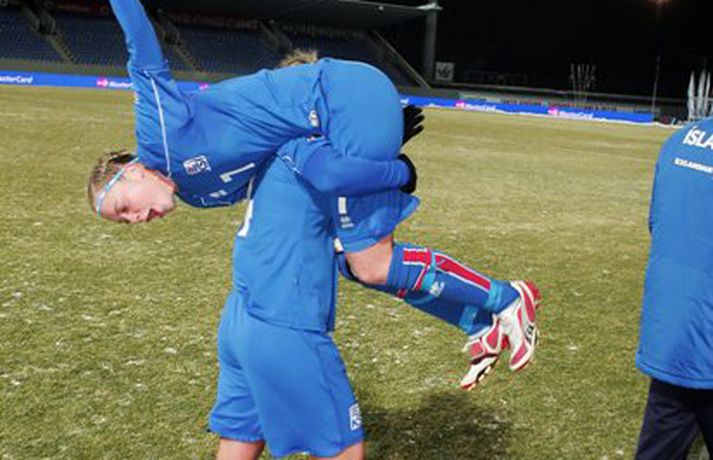 Myndasyrpa úr leik Íslands og Írlands Eiríkur Stefán Ásgeirsson skrifar 30. október 2008 23:15 Guðmundur Hreiðarsson markvarðaþjálfari og Katrín Ómarsdóttir stigu léttan dans eftir leikinn. Mynd/Daníel Ísland tryggði sér í kvöld sæti í úrslitakeppni Evrópumeistaramótsins sem fer fram í Finnlandi á næsta ári með 3-0 sigri á Írlandi á Laugardalsvelli í kvöld. Gríðarlega góð stemning var á leiknum og brutust út mikil fagnaðarlæti í leikslok þegar ljóst var að markmiðinu langþráða var náð. Íslenskt A-landslið í knattspyrnu hefur í fyrsta sinn tryggt sér sæti í úrslitakeppni stórmóts í knattspyrnu. Ljósmyndararnir Stefán Karlsson og Daníel Rúnarsson voru á vellinum í kvöld og má sjá myndasyrpu úr leiknum með því að smella á hlekkinn hér að neðan. Íslensku leikmennirnir tóku vel undir með þjóðsöngnum sem og áhorfendur á Laugardalsvelli í kvöld.DaníelByrjunarlið íslenska landsliðið sem vann 3-0 sigur á Írum í kvöld.DaníelDóra María Lárusdóttir skoraði tvö mörk í kvöld og lagði það þriðja upp. Hér er hún í baráttunni.DaníelÍslenska liðið fagnar fyrra marki Dóru Maríu.DaníelSara Björk Gunnarsdóttir í baráttunni.DaníelStuðningsmenn íslenska landsliðsins fjölmenntu á Laugardalsvöllinn í kvöld þrátt fyrir kuldann.DaníelÓlína Guðbjörg Viðarsdóttir átti góðan leik í kvöld sem og aðrir leikmenn íslenska liðsins.DaníelÞað er allt í lagi með þennan völl, gaf Margrét Lára Viðarsdóttir til kynna er hún fagnaði marki sínu í kvöld. StefánHólmfríður Magnúsdóttir þakkar áhorfendum fyrir stuðninginn.DaníelDóra Stefánsdóttir fær hér flugferð hjá liðsfélaga sínum.DaníelÍslensku landsliðskonurnar eftir leik.DaníelÁhorfendur hylltir. StefánGuðmundur Hreiðarsson markvarðaþjálfari og Katrín Ómarsdóttir stigu léttan dans eftir leik.Daníel Fótbolti Tengdar fréttir Sigurður Ragnar: Fyrsta skrefið að einhverju meira Sigurður Ragnar Eyjólfsson var vitanlega hæstánægður með sigur íslenska liðsins á því írska í kvöld en með honum tryggði Ísland sér þátttökurétt í úrslitakeppni EM sem fer fram í Finnlandi á næsta ári. 30. október 2008 20:57 Katrín: Ekkert sem toppar þetta Landsliðsfyrirliðinn Katrín Jónsdóttir á langan feril að baki og segir ekkert toppa það að komast á EM með landsliðinu. 30. október 2008 22:47 Margrét Lára: Ætlum að ná árangri á EM Margrét Lára Viðarsdóttir skoraði eitt mark í 3-0 sigri Íslands á Írlandi á Laugardalsvelli í kvöld en með sigrinum tryggði Ísland sér þátttökurétt á EM í Finnlandi á næsta ári. 30. október 2008 21:12 Ísland á EM Íslenska landsliðið tryggði sér í kvöld sæti í úrslitakeppni Evrópumótsins sem fer fram á Finnlandi eftir glæsilegan 3-0 sigur á Írlandi og samanlagt 4-1. 30. október 2008 17:33 Dóra María: Hef aldrei upplifað annað eins Dóra María Lárusdóttir var hetja íslenska liðsins gegn Írlandi í kvöld en hún skoraði tvö og lagði upp það þriðja í 3-0 sigri íslenska landsliðsins. Með sigrinum tryggði liðið sér þátttökurétt á EM í Finnlandi á næsta ári. 30. október 2008 21:50 Þjálfari Íra öskureiður: Þvílíkt virðingarleysi Noel King, þjálfari Írlands, sagði að kvennaknattspyrnu og leikmönnum hafi verið sýnd mikil vanvirðing með því að láta leik Íslands og Írlands fara fram á Laugardalsvelli í kvöld. Ísland vann leikinn, 3-0. 30. október 2008 22:26 Mest lesið Syrgja átján ára fimleikakonu Sport Írar ætli að fylgja eftir tillögu Heimis Fótbolti Gerir grín að klæðaburði liðsfélaga síns Körfubolti Cherki aðalmaðurinn í sigri City Enski boltinn Segir að Arsenal stefni á sögulega fernu á þessu tímabili Enski boltinn Þjálfar 2. flokk samhliða því að spila fyrir KR Íslenski boltinn Samþykkja hvern Rússann á fætur öðrum inn á Ólympíuleikana Sport Sjáðu dönsku þrumuna sem færði United-mönnum öll þrjú stigin Enski boltinn Amorim endaði viðtalið á gamansömum nótum Enski boltinn Stjórnin leyst frá störfum eftir að tólf ára drengur drukknaði Sport Fleiri fréttir Arnar Þór ráðinn til FIFA: „Himinlifandi að hafa fengið þetta starf“ Tap hjá Tómasi í grannaslagnum og toppbaráttan harðnar Liverpool - Wolves | Jota heiðraður á Anfield Arsenal - Brighton | Halda Skytturnar toppsætinu? Cherki aðalmaðurinn í sigri City Úlfarnir heiðruðu minningu Jota Enn tapa Albert og félagar Andri Lucas frá í mánuð Írar ætli að fylgja eftir tillögu Heimis Þjálfar 2. flokk samhliða því að spila fyrir KR Svakalegur derby-dagur fyrir Tómas Bent og félaga Sjáðu dönsku þrumuna sem færði United-mönnum öll þrjú stigin Segir að Arsenal stefni á sögulega fernu á þessu tímabili Sú besta í heimi ætlar sér að koma til baka löngu fyrir Íslandsleikinn Amorim endaði viðtalið á gamansömum nótum „Við eigum heima í Evrópu“ Malí tók stig af heimamönnum Daninn skaut Man. United upp fyrir Liverpool Amorim segir strákinn í frystinum vera framtíðin hjá Man. United Frönsk fótboltagoðsögn lést á jólunum Martinez með fyrirliðabandið og báðir Fletcher-bræðurnir á bekknum Mo Salah tryggði Egyptum sigur annan leikinn í röð Færeysk landsliðskona til liðs við ÍBV Havertz gæti snúið aftur á næstu dögum Alfons og Willum sáu tvö rauð spjöld fara á loft Óvissa í Indlandi lætur City selja Synir Diogo Jota leiða leikmenn út á Anfield Cunha vill skemmta og Howe treystir leikmönnum United horfir til Þýskalands eftir höfnun Semenyo „Þú birtir falsfrétt um mig, þú ert í banni“ Sjá meira