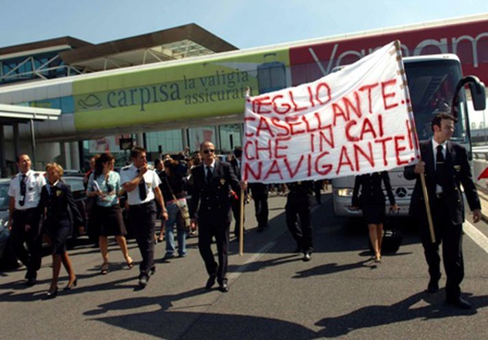 Flug Alitalia raskast vegna mótmæla starfsmanna 17. september 2008 14:20 Starfsmenn á vegum ítalska flugfélagsins Alitalia efndu í dag til verkfalls á Fiumicino-flugvelli í Róm til þess að mótmæla uppsögnum og endurskipulagningu á félaginu. Þetta hafði þær afleiðingar að umferð til og frá flugstöðinni stöðvaðist um tíma. Fyrr í dag þurfti Alitalia að aflýsa 40 flugferðum eftir að starfsmenn á vegum annars verkalýðsfélags efndu til fjögurra klukkustunda verkfalls til að mótmæla sömu aðgerðum félagsins. Var um að ræða bæði flugferðir innan lands og til annarra áfangastaða í Evrópu. Alitalia berst nú í bökkum og reyna ítölsk stjórnvöld að selja nærri helmingshlut sinn í félaginu. Air France hafði um tíma áhuga á að kaupa félagið en vegna mótmæla heima fyrir ákvað stjórn Silvios Berlusconis að reyna að finna innlenda kaupendur. Mest lesið „Við getum gert það sem við viljum“ Erlent „Þetta er svolítið óvenjulegt, ég er ekki á þingi“ Innlent Landsleikir á vinnutíma fela í sér tækifæri Innlent Kom ekki á teppið Innlent Foreldrarnir vissu ekki af kynferðisofbeldinu Innlent Halla slær á putta handboltahetjunnar Innlent Pétur vill leiða Viðreisn í Kópavogi Innlent Fengið svör frá Bandaríkjunum um Íslandsyfirlýsingar Trumps Innlent „Ég á þetta og má þetta“ Innlent „Ég framkvæmdi þetta af algjörri nauðsyn“ Innlent Fleiri fréttir „Við getum gert það sem við viljum“ Viti ekki hvað er í samningi NATO sem semji ekki fyrir hönd Grænlands Frakkar riðu á vaðið og tóku skuggaskip Rússa Sendi Evrópu tóninn: „Þú mótar ekki nýja heimsmynd með eintómum orðum“ Draumur Trumps um „Rivíeru Mið-Austurlanda“ lifir enn Samkomulagið sem ekkert samkomulag er um Drógu mann út á nærbuxunum sem hafði ekkert til saka unnið Trump kynnti friðarráðið Sýknaður af ásökunum um aðgerðaleysi þegar nítján börn dóu Rutte samdi ekki við Trump fyrir hönd danska konungsríkisins Handtóku fimm ára dreng og föður hans og sendu til Texas Samkomulagið veiti Bandaríkjunum aðgang að auðlindum Grænlands „Ramma framtíðarsamkomulags“ náð um Grænland og hætt við tolla Var á ráðstefnunni í Davos: „Fólk andaði kannski aðeins léttar“ X fyllist af gríni um Ísland/Grænland Þessi hönd er um sjötíu þúsund ára gömul Verði að eignast þetta „stóra fallega stykki af ís“ Fyrstu viðbrögð við ræðu Donalds Trump: „Ég bíð enn eftir að mennirnir í hvítu sloppunum nái í hann“ Höfuðstöðvar UNRWA í Jerúsalem rifnar Reyndu að fá dómara til að hlutast til um mál Le Pen Eldræða Carney: „Ef þú ert ekki við borðið þá ertu á matseðlinum“ Davos-vaktin: „Við fengum allt sem við vildum“ Hvað býr bakvið sólgleraugu Macron? Morðingi Abe dæmdur í lífstíðarfangelsi Vél Trump snúið við en ræðan enn á dagskrá Telur Trump gera mistök Einn látinn eftir annað lestarslys á Spáni Óvæntur blaðamannafundur: Las „afrekabókina“ og sýndi myndir af glæpamönnum Fæðingum fækkaði um 1,62 milljónir milli ára Varaði við lögmáli frumskógarins og hæddist að Trump Sjá meira