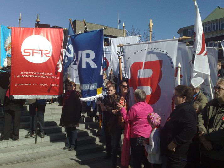 Kröfuganga verkalýðsfélaganna er nú að nálgast Ingólfstorg þar sem hátíðardagskrá er ráðgerð. Eins og sjá má af þessari mynd er margt um dýrðir í göngunni.