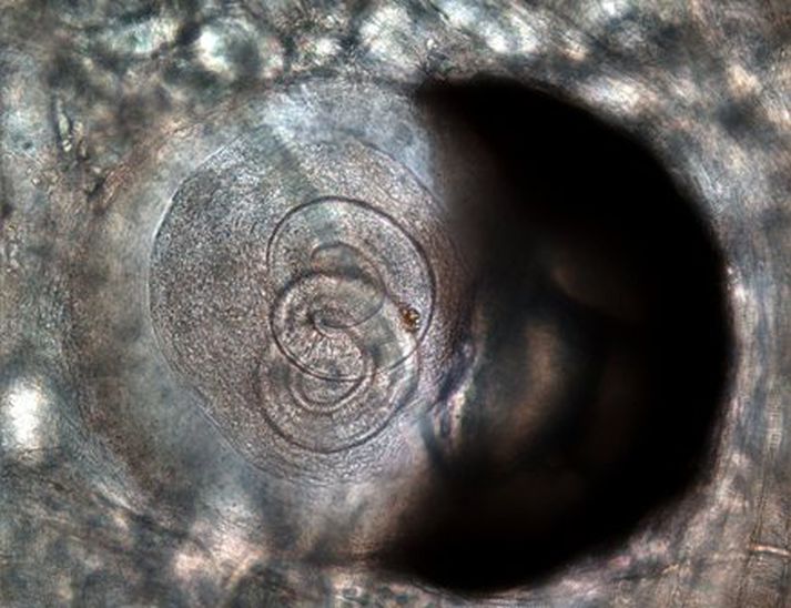 Ísbjörninn sem felldur var á Þverárfjalli fyrir um tveimur vikum reyndist smitaður af tríkínum sem eru þráðormar sem eru illskeyttir sjúkdómsvaldar í mörgum tegundum spendýra. Þetta var niðurstaða rannsókna Karls Skírnissonar, dýrafræðings á Tilraunastöðinni á Keldum, sem skoðaði björninn. Í tilkynningu frá honum kemur fram að það komi ekki á óvart því rannsóknir danskra sérfræðinga á ísbjörnum frá Austur-Grænlandi hafi sýnt að þar var um helmingur fullorðinna ísbjarna smitaður af tríkínum á 9. áratugnum. Karl segir að líkur á smiti aukist eftir því sem ísbirnir eldast en Þverárfellsbjörninn hafi verið miðaldra. „Þótt nokkur fita hafi verið á honum var hann samt óvenju léttur miðað við árstíma sem bendir til þess að árangur hans við kópaveiðar á ísnum á útmánuðum hafi verið lélegur. Ósagt skal látið hvort tríkínurnar höfðu áhrif á hreyfigetu dýrsins eða hvort einhverjir aðrir sjúkdómsvaldar voru líka að hrjá dýrið. Veirufræðingar á Keldum munu innan skamms leita að mótefnum í blóði dýrsins gegn nokkrum þekktum veirusjúkdómum. Hraunbirnan verður innan tíðar rannsökuð á sama hátt á Tilraunastöðinni á Keldum," segir í tilkynningunni. Á myndinni sést tríkínulirfa upprúlluð innan í þolhjúp í tungu ísbjarnarins sem felldur var við Þverfellsveg 3. júní 2008. Berist svona lirfur niður í meltingarfæri spendýra vaxa þær í fullorðna orma. Að mökun lokinni verpa kvenormarnir lirfum sem dreifast með blóðrás til vöðva dýrsins þar sem hver lirfa býr um sig í svona þolhjúp.MYND/Karl Skírnisson Þar kemur enn fremur fram að tríkínur séu þráðormar sem séu illskeyttir sjúkdómsvaldar í mörgum tegundum spendýra, meðal annars í refum, hundum, og nagdýrum. „Sníkjudýrið lifir líka auðveldlega í mönnum en menn smitast ekki nema við neyslu á hráu kjöti. Tríkínur valda sársaukafullum sjúkdómi þar sem lirfurnar búa um sig í vöðvum og trufla hreyfigetu dýranna. Mikið af lirfum safnast fyrir í vöðvum sem krefjast mikils blóðsteymis, til dæmis í tungu, kjálkavöðva, þind og hjarta en lirfurnar berast út um líkamann með blóðrásinni," segir Karl. Enn fremur bendir hann á að þráðormarnir hafi einu sinni áður fundist í ísbirni á Íslandi en sá var skotinn norður á Hornströndum á 7. áratugnum. „Tríkínur gætu auðveldlega haslað sér völl í íslensku lífríki, til dæmis ef refur eða hræétandi ránfuglar kæmust í kjöt af tríkínu-smituðum ísbirni. Vegna þessa er mikilvægt að farga ísbjarnarhræjum sem hér kunna að finnast eins fljótt og völ er á. Fljótlega verður rannsakað hvort birnan við Hraun var með tríkínur en Guðnýjarbjörninn margfrægi á Bolungarvík var ekki smitaður, segir Karl í tilkynningunni.