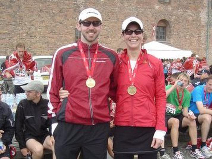 "Pilsið var að vísu svart en ég var í bleikum sokkum. Ég fór í hlaupið með það markmið að ná besta tíma ársins hjá íslenskum konum. Það var bara svo skemmtileg tilhugsun að geta sagt frá því eftir á, að ég hafi gert það í pilsi, stóðst ekki freistinguna," segir Eva Margrét Einarsdóttir starfsmaður Glitnis en hún hljóp ásamt eiginmanni sínum Þórólfi, í Kaupmannahafnar maraþoninu síðastliðinn sunnudag. Eva ásamt Jóhönnu Eiríksdóttur en hún toppaði Evu með því að hlaupa í kjól. "Það gekk allt saman upp og ég náði fimmta besta tíma íslenskrar konu í maraþoni frá upphafi. Svo er náttúrulega sérstaklega skemmtilegt að hlaupa framúr strákunum, í pilsi." "Ég fékk ótrúlega mikið klapp, bros og hvatningu frá konunum á hliðarlínunni, gaman að geta bæði verið stelpuleg og hlaupið hratt." Hjónin á fullri ferð komin ca. 16-17 km. "Ég byrjaði að hlaupa fyrir sex árum, þegar hún Bibba vinkona mín í vinnunni hvatti mig til að prófa og kom mér af stað, síðan var ekki aftur snúið." "Ég hafði alltaf átt í vandræðum með þyngd og mataræði frá því ég var krakki, í hlaupunum fann ég það jafnvægi sem ég þurfti til að ná tökum á því," svarar Eva þegar Vísir forvitnast af hverju hún byrjaði að hlaupa maraþon. Í sigurvímu eftir hlaupið. "Ekki spurning. Það er svo einfalt að fara út að skokka, skella sér í skóna og taka smá hring. Við hjónin skiptumst á að hlaupa þegar þannig stendur á, en við hlaupum líka mikið saman, það er svona okkar tími," svarar Eva aðspurð hvort maraþonhlaup er fjölskylduvænt sport. Góð ráð fyrir fólk sem langar að byrja að skokka? "Ég myndi ráðleggja fólki að byrja rólega en setja sér engu að síður ákveðin markmið. Félagsskapurinn skiptir líka miklu máli og það fyrsta sem ég myndi gera ef ég væri að byrja núna er að finna mér skokkhóp í hverfinu og láta vaða," segir Eva.