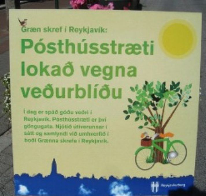 Pósthússtræti verður lokað í dag fyrir bílaumferð við Kirkjustræti. „Lokun á góðviðrisdögum er þáttur í Grænum skrefum í Reykjavík um lifandi og skemmtilega borg," segir Gísli Marteinn Baldursson. Í tilkynningu frá borginni kemur fram að lokunin sé í samræmi við Græn skref í Reykjavík en þar stendur: „Pósthússtræti meðfram Austurvelli verður gert að göngugötu í miðbæ Reykjavíkur á góðviðrisdögum." „Þegar Vallarstræti og Torvaldsenstræti var lokað fyrir bílaumferð á sínum tíma spruttu fram borð og stólar og mannlíf sem ekki hafði komist fyrir í bílaumferðinni," segir Gísli Marteinn Baldursson formaður umhverfis- og samgönguráðs. „Það sama gerist í Pósthússtrætinu þegar við lokum því og viðbrögðin frá borgarbúum hafa verið á eina lund jákvæð." Hann vísar til þess að Umhverfis- og samgöngusvið lokaði Pósthússtræti á liðnu sumri í tilraunaskyni. Í tilkynningunni er einnig minnt á á orð danska fræðimannsins og arkitektsins Jan Gehls sem hét fyrirlestur í Reykjavík í vikunni á vegum Félags íslenskra landslagsarkitekta: „Leiðin til að skapa rými fyrir fólk í borgum er að ganga á rými bifreiða og leiðin til að bjarga borg undan bílnum felst í því greiða götu gangandi og hjólandi með áberandi og áþreifanlegum hætti," sagði Jan Gehl. Þá kemur fram að Veðurstofa Íslands spái björtu fyrir Höfuðborgarsvæðið og 13 stiga hita. Pósthússtræti verður, vegna öryggisreglna, með aðgengi fyrir slökkvi- og sjúkrabifreiðar að norðanverðu.