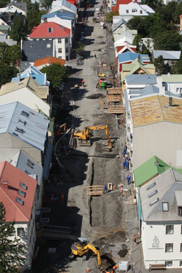 Hóteleigandi við Skólavörðustíg stakk upp á því að Ólafur F. Magnússon, borgarstjóri, kæmi og bæði viðskiptavini sína afsökunar á því að vatn var tekið af hótelinu í gær og afhenti þeim um leið miða í Sundhöllina. Frá klukkan sjö í gærmorgun til fjögur seinnipartinn var vatnslaust á Skólavörðustíg. Tilkynning þess efnis barst frá Orkuveitu Reykjavíkur daginn áður en framkvæmdirnir hófust. Eðlilegra hefði verið að vatnið væri tekið af um nóttina að mati Ragnars Guðmundssonar, eiganda Hótel Adams við Skólavörðustíg. ,,Ég hringdi í Jakob Frímann Magnússon og spurði hvað ég ætti að gera. Þá kom upp sú hugmynd að ég fengi miða til að láta fólk fá til að fara í Sundhöllina. Á móti stakk ég upp á því að hann kæmi með Ólaf borgarstjóra með sér svo hann gæti beðið fólk afsökunar um leið og hann afhenti miðanna," segir Ragnar og bætir við að Ólafur hafi ekki látið sjá sig. Frá Hallgrímskirkju. Framkvæmdir við Skólavörðustíg. Hótelgestum Ragnars hefur fækkað um 70% miðað við seinasta ár og kennir hann tímasetningu framkvæmdanna við götuna um þann samdrátt. Ragnar gagnrýnir embættismenn borgarinnar harðlega og þá sér í lagi fyrir framgöngu þeirra í málefnum Skólavörðustígs. ,,Embættismenn stjórna borginni enda er alltaf verið að skipta um pólitíkusa. Embættismennirnir eru alltaf að sýna að það eru þeir sem hafa valdið." Breytingarnar á Skólavörðustíg eiga rétt á sér að mati Ragnars sem segir að eigendur fasteigna og rekstraraðilar við götuna hafi á fundi í febrúar lagt til að framkvæmdirnar hæfust í janúar á næsti ári. Ekki var tekið tillit til tillögunnar. ,,Embættismenn borgarinnar ákveða að gera eitthvað þegar þeim dettur það í hug." ,,Ég hugsa að Orkuveitan hefði gaman að setja nýjan rafmagnskapal inn í Kringluna. Það væri hægt að leggja hann á milli 15. og 25. desember og hafa rafmagnslaust dagana 20. til 24. desember. Það er alveg rétti tíminn og yrði vafalaust vinsælt," segir Ragnar að lokum.