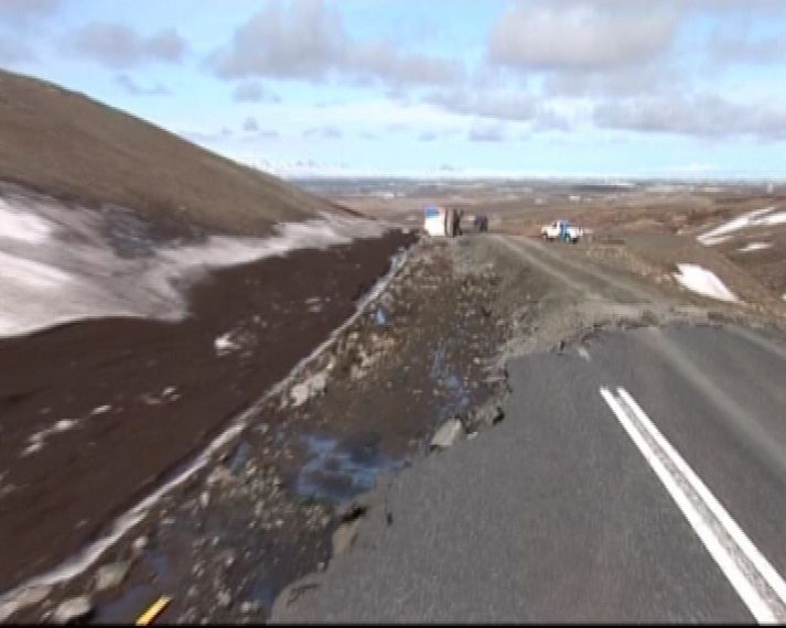 Kristján Steinarsson, vöruflutningabílstjóri hjá Flytjanda komst í hann krappan í gær þegar hringveginum skolaði bókstaflega burt á 200 metra kafla. Kristján var á leið frá Reyðarfirði til Akureyrar og var staddur nálægt bænum Grímsstöðum á fjöllum í svarta þoku þegar hann tók eftir því að lækur hafði myndast meðfram veginum. „Ég var nýbúinn að tala við annan bílstjóra og segja honum að það mætti ekki rigna mikið því þá væri vegurinn í hættu," segir Kristján í samtali við Vísi. Hann segir að sem betur fer hafi þokunni létt lítið eitt og þá hafi hann séð traktorsgröfu við vegarkantinn sem var að reyna að losa klakahröngl frá ræsi við veginn. „Þá sá ég að það var farið að flæða upp á veginn og ég ákvað að stoppa. Það var eins gott því þegar ég reyndi að bakka þá skildi tengivagninn eftir gat í veginum sem ég komst ekki yfir." Kristján segist þá hafa farið út úr bílnum og séð að svelgur hafi myndast aftan við bílinn. Maðurinn á traktorsgröfunni reyndi að mynda undankomuleið fyrir bílinn, sem er flutningabíll með tengivagni, en í þann mund gaf vegurinn sig og bíllinn sökk niður á stuðara. Eins og sjá skolaði veginum burt á löngum kafla.„Þá fór ég út úr honum aftur og gat lítið gert annað en að horfa á hann velta á hliðina. Stuttu seinna fór vegurinn í sundur fyrir framan bílinn og síðan fyrir aftan og eftir stutta stund var heljarinnar fljót komið þar sem vegurinn hafði verið," segir Kristján sem er frá Akureyri. Hann segir óljóst um ástand bílsins en gerir ekki ráð fyrir að hann verði ökufær á næstunni.