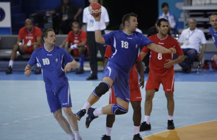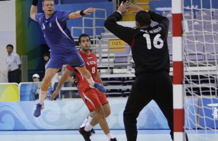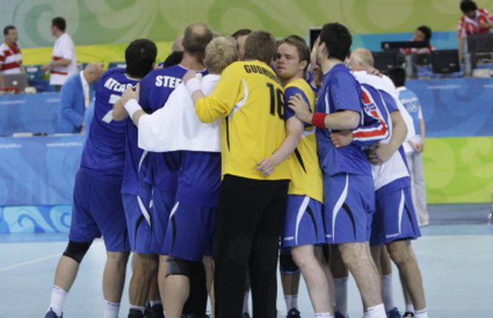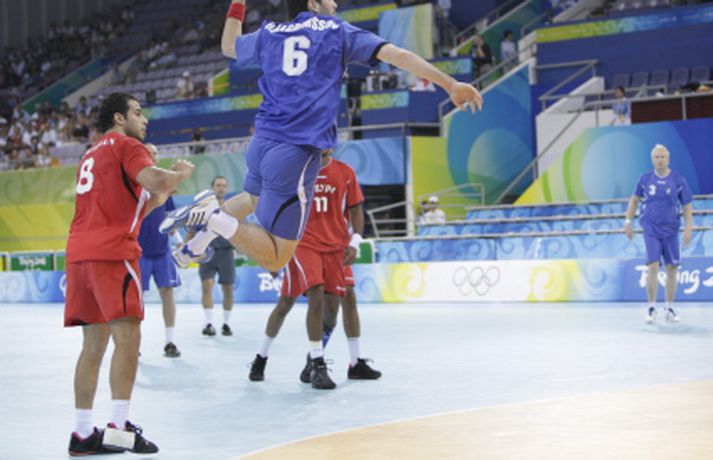 „Ég ætla ekki að hugsa um eitthvað sem hefði átt að vera. Þetta var bara akkúrat eins og það átti að vera. Nú þurfum við strax að byrja á að fókusa á það sem kemur eftir tvo daga en það er stórleikur," sagði Ólafur Stefánsson landsliðsfyrirliði. „Menn verða að halda sér í réttri spennu fram að því. Andstæðingurinn sem við fáum er bara uppáhaldsandstæðingurinn. Við getum unnið þá alla og vinnum þá alla. Líkamlega standið er frábært og við þurfum að vita hvað hinn er að hugsa. Stilla okkur saman. Það þarf allt að vera í samræmi og þá erum við ógeðslega góðir. Það vantar ekkert upp á kraft og snerpu. Þetta lið er það reynslumikið að menn eiga að höndla pressuna," sagði Ólafur en hvernig fannst honum að spila handbolta klukkan 9 um morguninn? „Það er bara gaman og ágætt að vera búinn snemma. Næsti leikur verður á aðeins eðlilegri tíma."Íslenski landsliðshópurinn þjappar sér saman fyrir síðustu sókn leiksins sem tryggði Íslandi sigurinn. Vilhelm GunnarssonGuðmundur Guðmundsson landsliðsþjálfari segir sínum mönnum til. Vilhelm GunnarssonHér vill hann fá brottvísun á egypskan leikmann. Vilhelm GunnarssonBjörgvin Páll Gústavsson kom einu sinni við sögu í leiknum er hann freistaði að verja víti frá Zaky. Það tókst honum ekki, frekar en Hreiðari. Vilhelm GunnarssonHreiðar sér hér eftir af boltanum í íslenska markið. Vilhelm GunnarssonSigfús er kátur í bragði í leikslok og ræðir hér við Guðmund. Vilhelm GunnarssonHér ræða hann og Guðjón Valur málin. Vilhelm GunnarssonRóbert Gunnarsson sýndi ótrúlega takta á línunni og skoraði sex mörk úr jafn mörgum skotum. Fiskaði þar að auki eitt víti. Vilhelm GunnarssonÓlafur Stefánsson skoraði aðeins tvö mörk í leiknum. Tók aðeins þrjú skot í það heila. Vilhelm GunnarssonGuðjón Valur átti frábæran leik og skoraði tíu mörk. Vilhelm GunnarssonÁsgeir Örn náði sér ekki á strik og skoraði eitt mark. Vilhelm GunnarssonRóbert í kunnulegri stöðu á línunni. Vilhelm GunnarssonLogi kom sterkur inn í upphafi síðari hálfleiks og skoraði þrjú í röð. Vilhelm GunnarssonSigfús Sigurðsson brá sér í sóknina og skoraði eitt gott mark. Vilhelm GunnarssonÓlafur og Guðmundur ræða málin. Vilhelm Gunnarsson