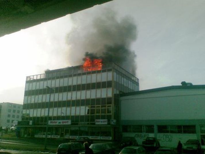 Mikill eldur braust út í Síðumúla 34 í Reykjavík. Slökkviliðið sendi allt tiltækt lið á vettvang. Í húsinu eru meðal annars fyrirtækin Ferskar kjötvörur, Adagio hárstofa og Mótorsport. Íbúar í nágrenninu er beðnir um að loka gluggum og kynda hús sín eins og kostur er. Einnig er fólk beðið um að halda sig frá vettvangi en þetta kemur fram í tilkynningu frá slökkviliðinu vegna brunans. MYND/Jóhann Ómarsson. Svo virðist sem eldurinn hafi brotist út á efstu hæð hússins eins og meðfylgjandi mynd sýnir. Talið er að eldurinn hafi kviknað út frá þakviðgerðum en á efstu hæð hússins er íbúðarhúsnæði. Smelltu hér til þess að sjá beina útsendingu frá myndavél á þaki Orkuveitunnar.