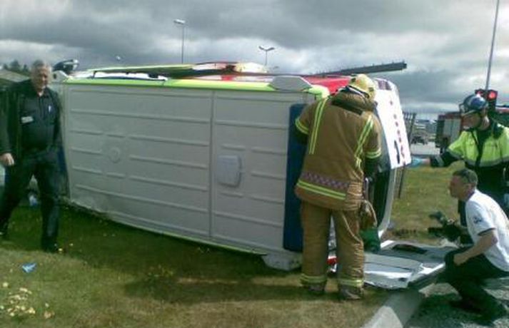Sjúkrabifreið valt við umferðamiðstöðina - myndir 14. júlí 2009 13:44 Ekið var á sjúkrabifreið á mótum Njarðargötu og Hringbrautar fyrir nokkrum mínútum með þeim afleiðingum að hún valt. Sjúkrabifreiðin var á leið í útkall í vesturbænum þegar bifreið ók inn í hliðina á honum. Sjúkraflutningamönnunum varð ekki meint af en flytja þurfti ökumann hinnar bifreiðarinnar á slysadeild til aðhlynningar.Sjúkrabifreið á hlið.Sjúkrabifreið á hlið.Sjúkrabifreið á hlið Mest lesið Vanhelgunin ýmist skemmdarverk eða persónuleg árás Innlent Árið gert upp í Kryddsíld 2025 Innlent „Margir sem því miður eru ekki jafn heppnir og ég“ Innlent Segir myndbandsupptöku af því þegar skórnir voru teknir Innlent Dótturdóttir JFK er látin Erlent Tveir með alvarlega áverka eftir hnífstunguárás Innlent Kamilla Bretadrottning greinir frá kynferðisofbeldi Erlent Grunaður um stórfellda líkamsárás og frelsissviptingu Innlent Eitthvað í íslensku samfélagi fjandsamlegt börnunum okkar Innlent Enn fleirum sagt upp hjá Árvakri Innlent Fleiri fréttir Eitthvað í íslensku samfélagi fjandsamlegt börnunum okkar Simmi vinsælasti leynigesturinn „Þetta er Íslandsmet, Íslandsmet í svikum“ Tal um Ingu eftir kosningar ekki til sóma Gummi lögga er maður ársins 2025 Árangur breyti ekki alltaf upplifun fólks „Viðreisn jafnvel erfiðari viðfangs en Flokkur fólksins“ Vara við hættu á sinubruna Haldlögðu metmagn af fíkniefnum á árinu Vanhelgunin ýmist skemmdarverk eða persónuleg árás Árið gert upp í Kryddsíld 2025 Hafþór Freyr maður ársins að mati lesenda Vísis og hlustenda Bylgjunnar Segir myndbandsupptöku af því þegar skórnir voru teknir Tveir með alvarlega áverka eftir hnífstunguárás Vonast til að rafmagn verði komið á seinni partinn Rúmur helmingur bjartsýnn fyrir 2026 Grunaður um stórfellda líkamsárás og frelsissviptingu „Við bara svolítið sitjum uppi með þetta“ Börn niður í leikskólaaldur um helmingur þeirra sem slasast „Margir sem því miður eru ekki jafn heppnir og ég“ Sátt við fyrsta árið og taka stöðuna vegna forfalla ráðherra á næstu dögum Tíu létust í umferðinni á árinu og alvarlegustu slysunum fækkar ekki Árangur aðgerða ekki staðist væntingar almennings Enn fleirum sagt upp hjá Árvakri Ríkisstjórnin sek um ósanngjarna mismunun Vonbrigði í menntamálum og áramótasprengja Hafa áhyggjur af frelsissviptingu barna í brottfararstöð Kristrún ræðir við Pétur um borgarstjórnarframboð Níu ráðherrar funda með Höllu Söfnun fyrir Kjartan gengur vel Sjá meira