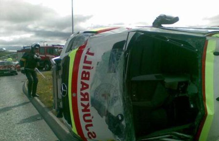 Ekið var á sjúkrabifreið á mótum Njarðargötu og Hringbrautar fyrir nokkrum mínútum með þeim afleiðingum að hún valt. Sjúkrabifreiðin var á leið í útkall í vesturbænum þegar bifreið ók inn í hliðina á honum. Sjúkraflutningamönnunum varð ekki meint af en flytja þurfti ökumann hinnar bifreiðarinnar á slysadeild til aðhlynningar.Sjúkrabifreið á hlið.Sjúkrabifreið á hlið.Sjúkrabifreið á hlið