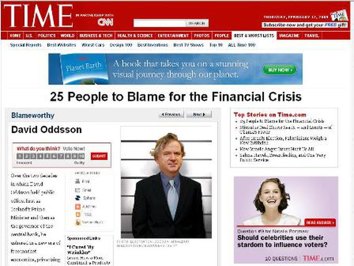 Davíð Oddson seðlabankastjóri er á meðal þeirra 25 einstaklinga sem bandaríska tímaritið Time tiltekur sem helstu sökudólga fjármálakrísunnar sem riðið hefur yfir heimsbyggðina undanfarið. Lesendum gefst kostur á að greiða atkvæði á skalanum 1 og upp í 10 um hve sök viðkomandi sé stór í málinu. Sökudólgunum er síðan raðað upp í röð eftir atkvæðafjölda og eins og staðan er í dag er Davíð í 19. sæti listans. Dick Fuld, forstjóri Lehman brothers er í efsta sæti listans. Með Davíð á listanum eru ekki ómerkari menn en Alan Greenspan, fyrrverandi seðlabankastjóri í Bandaríkjunum, Henry Paulson fyrrverandi fjármálaráðherra þar í landi og forsetarnir fyrrverandi þeir Bill Clinton og George W. Bush. Blaðamaður Time segir að í þá tvo áratugi sem Davíð Oddson hefur verið í valdamiklum embættum á Íslandi, fyrst sem forsætisráðherra og síðar sem seðlabankastjóri, hafi hann innleitt nýja tíma í íslensku efnahagslífi, sem hafi einkennst af einkavæðingu bankanna og miklum uppgangi. Hann er sagður hafa lagt grunninn að íslensku útrásinni sem hafi endað með hruni efnahagskerfisins. „Góð tilraun," segir Time að lokum.Hér er hægt að sjá listann og taka þátt í kjörinu.