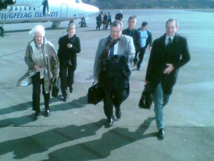Jóhanna og Össur komin norður 12. maí 2009 12:07 Þau Jóhanna Sigurðardóttir forsætisráðherra og Össur Skarphéðinsson utanríkisráðherra lentu á Akureyrarflugvelli fyrir hádegið en ríkisstjórnarfundur hófst í Ráðhúsi Akureyrar í hádeginu. Mest lesið „Það er ósatt, ósatt með öllu“ Innlent Sættir sig ekki við sýknu lögreglumannsins Innlent Kennarasambandið mismunaði konu Innlent „Fokk ðe queers og fullt af atkvæðum?“ Innlent „Húsið er náttúrulega einstaklega fagurt“ Innlent Sjálfstæðisflokkurinn flytur í húsnæði Sjóvár Innlent Mandelson veitt öryggisheimild þrátt fyrir að hafa fallið á bakgrunnsathugun Erlent Skiptir um nefnd eftir tvo daga í þeirri fyrri Innlent Stöðvaður með of marga farþega og einn í skottinu Innlent Máttu vísa mæðgunum úr félaginu eftir allt saman Innlent Fleiri fréttir Takmarkaður áhugi Petoro á Drekasvæðinu Mörg dæmi um að tekið sé sérstakt tillit til umsóknarríkja „Það er ekki hægt að plata þjóðina inn í Evrópusambandið“ Skiptir um nefnd eftir tvo daga í þeirri fyrri Bak við lás og slá grunaður um risastórt kókaínsmygl Sjávarútvegsstjóri ESB í heimsókn og fíkniefni í Norrænu Frestur til að svara fyrirspurn ESA löngu útrunninn Bein útsending: Fundur atvinnuvegaráðherra og sjávarútvegsstjóra ESB Sættir sig ekki við sýknu lögreglumannsins Máttu vísa mæðgunum úr félaginu eftir allt saman Flestir vilja leiguþak Sjálfstæðisflokkurinn flytur í húsnæði Sjóvár Dæmdur í 30 daga skilorðsbundið fangelsi fyrir að ráðast á dreng vegna dyraats „Húsið er náttúrulega einstaklega fagurt“ Stöðvaður með of marga farþega og einn í skottinu „Það er ósatt, ósatt með öllu“ Samningur um Ísafjörð tryggir rekstur Q200-véla Icelandair Kennarasambandið mismunaði konu Útlit fyrir að íslensk stjórnvöld brjóti gegn alþjóðasamningum „Fokk ðe queers og fullt af atkvæðum?“ Meitlarnir komust loks í forgang eftir stefnubreytingu Stóra aðgerðin valdi titringi á fíkniefnamarkaði Ekki síður í vandræðum með bóklega kennslu Áhrif smyglmáls og hugsanleg brot stjórnvalda á alþjóðlegum skuldbindingum Flúði heimili sitt eftir að hafa hótað stofnun MMS ekki kunnugt um neinar breytingar á einkunnagjöf Aðstoðarskólastjóri Stapaskóla biður nærsamfélagið um hjálp Félag Ragnars Freys telur uppsögn hans ólögmæta Skálmöld stígur ölduna í héraðsdómi „Áfall fyrir starfsfólk“ Sjá meira