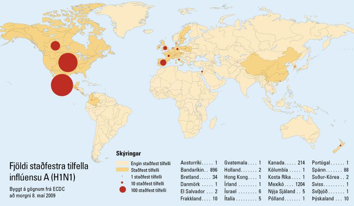 Staðfest tilfelli inflúensu A (H1N1) voru alls 2.489 í morgun í 24 ríkjum í heiminum og hafði fjölgað um 272 á síðastliðnum sólarhring samkvæmt upplýsingum Sóttvarnarstofnunar ESB. Í tilkynningu frá Sóttvarnalækni og Almannavarnadeild segir að flest ný staðfest tilfelli séu í Bandaríkjunum, Mexíkó og Kanada en þau voru mun mun færri í morgun en í gærmorgun í daglegri skýrslu Sóttvarnarstofnunar ESB. „Nýjum tilfellum hefur líka fækkað í ríkjum innan ESB og EFTA eins sjá má á súluriti hér fyrir neðan (mynd til vinstri) þar sem unnt er að sjá fjölda staðfestra tilfella í ESB/EFTA-ríkjum frá mánudegi 27. apríl til fimmtudags 7. maí. Súluritið til hægri sýnir glögglega að flestir sem greinast með inflúensuna í ESB/EFTA eru á aldrinum 20-29 ára," segir einnig í tilkynningunni. Útbreiðsla inflúensunnar 8. maí 2009. Alþjóðaheilbrigðisvöld halda óbreyttu viðbúnaðarstigi sínu enn um sinn og viðbúnaði hérlendis er haldið áfram á hættustigi. Þá segir að niðurstöður rannsókna í Bandaríkjunum bendi til að bóluefni gegn hinni árlegu inflúensu veiti ekki vernd gagnvart inflúensu A (H1N1). Engin tilfelli hafa verið greind hér á landi önnur en hin „venjulega" árstíðabundna inflúensa.
