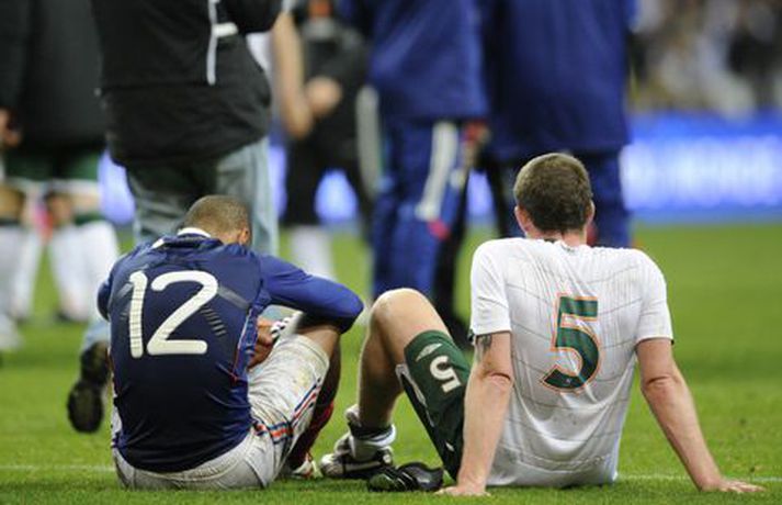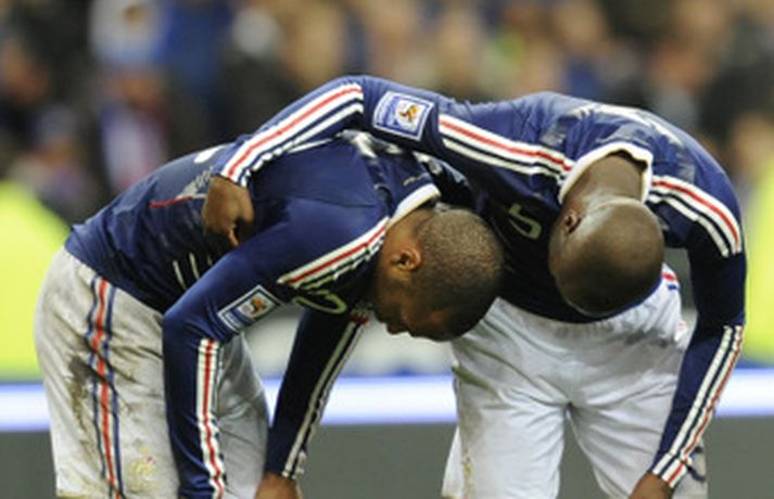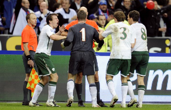 Frakkar komust í gær áfram á HM í Knattspyrnu í Suður Afríku næsta sumar þegar þeir tryggðu sér 1-1 jafntefli í framlengingu á móti Írum í seinni umspilsleik liðanna sem fram fór í París. Jöfnunarmarkið sem kom Frökkum á HM var hinsvegar kolólöglegt og á myndunum í myndasafninu hér fyrir neðan má sjá greinilega sönnun þess að Thierry Henry tók boltann með hendinni áður en hann lagði upp mark Williams Gallas. Thierry Henry viðurkenndi eftir leikinn að hann hafði tekið boltann með hendinni enda sást það líka greinilega í sjónvarpsupptökum frá leiknum. Sterk viðbrögð írsku leikmannanna virtust þó ekkert hreyfa við dómurum leiksins sem dæmdu markið gilt. Samviskan var líka greinilega að naga Henry eftir leikinn og það var á nokkrum þessara mynda eins og hann hefði tapað leiknum. Írar voru að sjálfsögðu mjög ósáttir með niðurstöðu mála en ekkert verður þó að því að leikurinn verði endurtekinn. Breskir fjölmiðlar hafa fjallað gríðarlega mikið um málið og kalla atvikið "Le Hand of god" eða Le hendi guðs en með því vitna þeir í handamarkið hans Diego Maradona sem átti stóran þátt í að slá Englendinga út úr átta liða úrslitum HM í Mexíkó 1986. Mynd/AFPMynd/AFPMynd/AFPMynd/AFPMynd/AFPMynd/AFPMynd/AFPMynd/AFPMynd/AFP