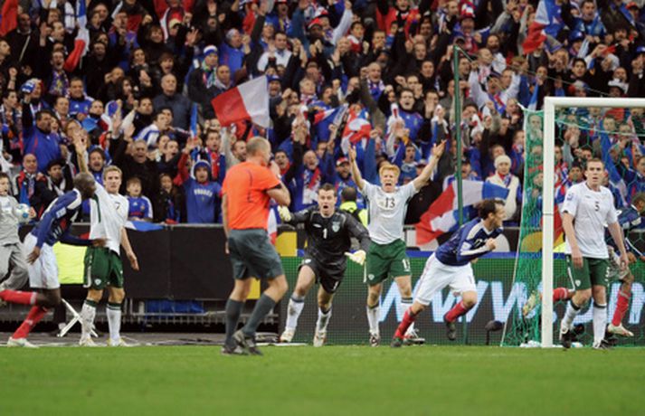 Le hendin hans Henry - myndirnar ljúga ekki Óskar Ófeigur Jónsson skrifar 19. nóvember 2009 14:00 Það sést greinilega á endursýningum á marki Frakka að Henry tók boltann með hendinni. Mynd/AFP Frakkar komust í gær áfram á HM í Knattspyrnu í Suður Afríku næsta sumar þegar þeir tryggðu sér 1-1 jafntefli í framlengingu á móti Írum í seinni umspilsleik liðanna sem fram fór í París. Jöfnunarmarkið sem kom Frökkum á HM var hinsvegar kolólöglegt og á myndunum í myndasafninu hér fyrir neðan má sjá greinilega sönnun þess að Thierry Henry tók boltann með hendinni áður en hann lagði upp mark Williams Gallas. Thierry Henry viðurkenndi eftir leikinn að hann hafði tekið boltann með hendinni enda sást það líka greinilega í sjónvarpsupptökum frá leiknum. Sterk viðbrögð írsku leikmannanna virtust þó ekkert hreyfa við dómurum leiksins sem dæmdu markið gilt. Samviskan var líka greinilega að naga Henry eftir leikinn og það var á nokkrum þessara mynda eins og hann hefði tapað leiknum. Írar voru að sjálfsögðu mjög ósáttir með niðurstöðu mála en ekkert verður þó að því að leikurinn verði endurtekinn. Breskir fjölmiðlar hafa fjallað gríðarlega mikið um málið og kalla atvikið "Le Hand of god" eða Le hendi guðs en með því vitna þeir í handamarkið hans Diego Maradona sem átti stóran þátt í að slá Englendinga út úr átta liða úrslitum HM í Mexíkó 1986. Mynd/AFPMynd/AFPMynd/AFPMynd/AFPMynd/AFPMynd/AFPMynd/AFPMynd/AFPMynd/AFP HM 2010 í Suður-Afríku Mest lesið Gleði og sorg í sigri Liverpool Enski boltinn Joshua kjálkabraut Paul Sport Gagnrýndi Paul: „Beið eftir að verða sleginn“ Sport Salah bað samherjana afsökunar Enski boltinn Slot fámáll um stöðuna á Isak Enski boltinn Rekinn af HM eftir að hafa fallið á lyfjaprófi Sport Everton - Arsenal | Skytturnar vilja skjóta sér aftur upp á topp Enski boltinn Lineker fokillur við blaðamann: „Þvílíkt kjaftæði“ Enski boltinn Chelsea vann upp tveggja marka forskot á St James' Park Enski boltinn Ronaldo á nærbuxunum lætur Elon Musk efast um sjálfan sig Fótbolti Fleiri fréttir Ronaldo á nærbuxunum lætur Elon Musk efast um sjálfan sig Orri Steinn kominn með nýjan þjálfara Slot fámáll um stöðuna á Isak Gleði og sorg í sigri Liverpool Everton - Arsenal | Skytturnar vilja skjóta sér aftur upp á topp Real Madrid - Sevilla | Tekst að róa ástandið fyrir jól? Willum spilaði sinn fyrsta leik í tæpa fjóra mánuði Dramatík er Broja reyndist hetja Burnley Haaland frábær er Manchester City komst á toppinn Skagastrákarnir áttu misjöfnu gengi að fagna Afríkukeppnin verður haldin á fjögurra ára fresti Andri Lucas skoraði í langþráðum sigri Blackburn Chelsea vann upp tveggja marka forskot á St James' Park Ekkert fararsnið á Guardiola sem segir að City verði að vera undirbúið Tíu bestu mörkin úr leikjum Liverpool og Tottenham Salah bað samherjana afsökunar Lineker fokillur við blaðamann: „Þvílíkt kjaftæði“ Skírði soninn LFC og Mac Allister lét draum feðganna rætast Varði fjórar vítaspyrnur með brotna hendi Immobile skaut Bologna í úrslit Jóga og pílates lykillinn að snöggri endurkomu Hrannar Snær til Noregs Breiðablik, Valur og Þór/KA fengu milljónir vegna EM Elías mættur til meistaranna Syrgir góðan félaga í Åge: „Ótrúlega leiðinlegt að hann sé nú farinn“ KR sagt vera að landa Arnóri Ingva Fantasýn: „Hann setti allt á 3 og það kom upp 19“ Karólína Lea því miður of snemma í jólafrí Alexander Isak fékk sænska gullboltann Hilmar Árni til starfa hjá KR Sjá meira