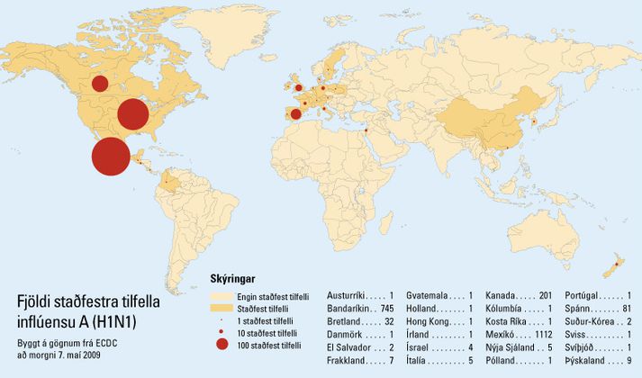 Staðfest tilfelli inflúensu A (H1N1) voru alls 2.217 í morgun í 24 ríkjum í heiminum og hafði fjölgað um 568 á síðastliðnum sólarhring samkvæmt upplýsingum Sóttvarnarstofnunar ESB. Í tilkynningu frá Sóttvarnarlækni og Almannavarnadeild segir að inflúensan hafi nú verið staðfest í fyrsta sinn í Svíþjóð og Póllandi, eitt tilfelli í hvoru landi en sem fyrr er ástandið alvarlegast í Mexíkó þar sem staðfest tilfelli eru ríflega 1.100 og 42 dauðsföll eru rakin til veikinnar. „Staðfestum tilfellum fjölgaði mest í Bandaríkjunum á síðastliðnum sólarhring. Þar eru þau orðin 745 talsins, þar af tvö dauðsföll. Í Evrópu fjölgar staðfestum tilfellum mest á Spáni," segir ennfremur. Þó ber ekki að túlka tölur um fjölgun tilfella beinlínis sem vísbendingu um aukna útbreiðslu veikinnar heldur er sennileg skýring annars vegar sú að sífellt fleiri rannsóknarstofur fái nú búnað til að greina inflúensuveiruna og hins vegar að stjórnvöld ríkja hafi eflt vöktun í heilbrigðiskerfum sínum til að fylgjast sem best með ástandinu á hverjum tíma. Staðfest tilfelli inflúensu A þann 7. maí 2009. Staðan á Íslandi Enginn hefur verið lagður inn á Landspítalann vegna gruns um inflúensusmit. Ekkert tilfelli inflúensu A (H1N1) hefur greinst hérlendis. „Heilbrigðisyfirvöld hér á landi hafa áfram varann á vegna inflúensunnar og nota tækifærið til að fara gaumgæfilega yfir marga lykilþætti í gildandi landsáætlun almannavarna vegna heimsfaraldurs inflúensu. Með annars er verið að kanna birgðastöðu matvæla, olíu, nauðsynlegra lyfja og annarra nauðsynjavara í landinu," segir einnig í tilkynningunni. Nánari upplýsingar um inflúensuna og ráðstafanir í því sambandi er að finna á landlaeknir.is, almannavarnir.is, influensa.is og heimasíðum Sóttvarnarstofnuanr Evrópusambandsins - ECDC, http://www.ecdc.europa.eu/ og Alþjóðaheilbrigðismálastofnunarinnar - WHO, http://www.who.int/en/.