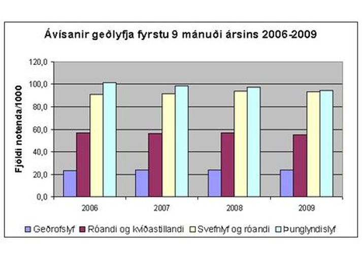 Notkun geðlyfja hefur ekki aukist í kreppunni 18. nóvember 2009 21:00 Úr myndasafni. Mynd/Anton Brink Einn þeirra mælikvarða sem Landlæknisembættið hefur til þess að meta hugsanleg áhrif kreppunnar á heilbrigði landsmanna er að fylgjast með notkun geðlyfja og bera saman við fyrri ár. Fram kemur í á vef embættisins að engin aukning hefur verið á fjölda þeirra einstaklinga sem nota geðlyf fyrstu 9 mánuði þessa árs miðað við sömu mánuði undanfarin þrjú ár.Súluritið hér til hliðar sínir fjölda þeirra sem nota geðrofslyf, þunglyndislyf, svefnlyf og róandi lyf. Mest lesið Ríkissjóður greiðir fyrir flutning hinna látnu til Íslands Innlent Falskar netverslanir: Auglýsir rýmingarsölu nokkrum dögum eftir opnun Innlent „Krítískur massi af snarbrjáluðu fólki nær yfirhöndinni“ Innlent Íslendingur í gæsluvarðhaldi í Kólumbíu vegna gruns um kynferðisbrot Innlent Ekið á konu á Langholtsvegi Innlent Lögreglan lýsir eftir Birni Þorláki Innlent Trump nefnir nýja kynslóð orrustuskipa í höfuðið á sjálfum sér Erlent Undrandi á ráðningu ráðgjafa Innlent Fleiri Epstein-skjöl birt: Prinsinn bað um „óviðeigandi vinkonur“ Erlent Hyggst kæra dyraverði Auto til lögreglu Innlent Fleiri fréttir Óvissa um ráðherraskipan og skata fyrir byrjendur Lögreglan lýsir eftir Birni Þorláki Sigríður Halldórsdóttir nýr ritstjóri Kastljóss Íslendingur í gæsluvarðhaldi í Kólumbíu vegna gruns um kynferðisbrot Forsætisráðuneytið eyddi meiru í almannatengla í fyrra en í ár Inkalla snuð vegna of mikils magns BPA-plastefna Svanhildur Sif heiðruð Falskar netverslanir: Auglýsir rýmingarsölu nokkrum dögum eftir opnun Meðallaun upplýsingafulltrúa hækkuðu hlutfallslega mest Skötuilmurinn leggst yfir landið og Samkeppniseftirlitið ætlar að fylgjast vel með bensínverðinu Áfram auknar líkur á eldgosi Sektaður um hundruð þúsunda fyrir að sparka í hund Stýra fjármálum og mannauðsmálum Þjóðleikhússins Sló mann í höfuðið með glerflösku á ísfirskum skemmtistað Ekið á konu á Langholtsvegi Ríkissjóður greiðir fyrir flutning hinna látnu til Íslands Undrandi á ráðningu ráðgjafa „Krítískur massi af snarbrjáluðu fólki nær yfirhöndinni“ Fjölgun eldri kvenna í Kvennaathvarfi: „Þessar konur bíða ekki“ Ráðist á pilt á heimleið Stytting framhjá Blönduósi ekki á samgönguáætlun Vestmannaeyingar fá að eiga Vestmannaeyjar Hyggst kæra dyraverði Auto til lögreglu „Ótrúlega sorglegt að pabbi sé búinn að vera svona lengi í þessari stöðu“ Höfðu samband við dönsku herstjórnina á Grænlandi Ný könnun Maskínu: „Væri alveg ný staða í íslenskum stjórnmálum“ Glæný Maskínukönnun og jólaóveður Ársæll hringdi beint í utanríkisráðherra eftir fundinn Ósannað að fimmtán ára stúlka hafi stungið sextán ára pilt tvisvar Sameina Farice, Öryggisfjarskipti og hluta Neyðarlínunnar Sjá meira