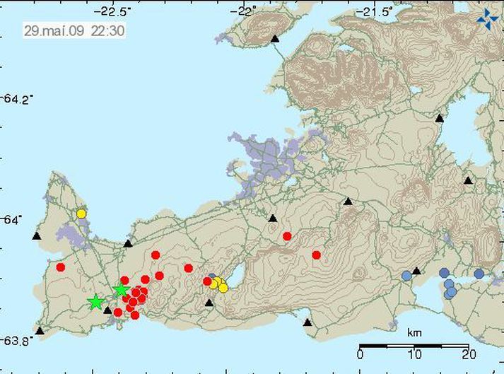 Margir smáskjálftar við Grindavík 30. maí 2009 09:21 Margir smáskjálftar hafa verið í nótt norðaustan við Grindavík þar sem jarðskjálfti, sem mældist 4,9 stig á Richter, varð um hálftíuleytið í gærkvöld. Flestir hafa skjálftarnir verið litlir, en þrír þeirra voru yfir 3 á Richter. Þar af mældist einn upp á 3,3 á Richter laust eftir klukkan tvö í nótt. Ekki er vitað til þess að neinar skemmdir hafi orðið á skjálftunum. Mest lesið Áslaug Arna boðar endurkomu á Alþingi Innlent Hafa fundið nýtt jarðhitasvæði á Hellisheiði Innlent Gripinn í blokk við þvottastúss eftir árásina Innlent Ölduselsskóla skipt út fyrir Seljaskóla Innlent Samið við Icelandair um flug til Ísafjarðar Innlent Kallar aðgerðirnar leiktjöld og varar við verðstýringu Innlent Stjórnvöld í Frakklandi vilja fá ríkisborgara lausan Erlent Að minnsta kosti fimmtán létust í árásum Rússa á Úkraínu Erlent CNN og ABC fjalla um Eyjaflugið Innlent Bækurnar of leiðinlegar og forritaði stærðfræðitölvuleik Innlent Fleiri fréttir Svavar Sigmundsson er látinn Líkamsárás, húsbrot og eignaspjöll Samið við Icelandair um flug til Ísafjarðar Hafa fundið nýtt jarðhitasvæði á Hellisheiði Fagnar fjölgun skráninga í Þjóðkirkjuna Ölduselsskóla skipt út fyrir Seljaskóla Kallar aðgerðirnar leiktjöld og varar við verðstýringu CNN og ABC fjalla um Eyjaflugið Áslaug Arna boðar endurkomu á Alþingi Gripinn í blokk við þvottastúss eftir árásina Fleiri andvígir aðild nú en í fyrra Ingimar er bæjarstjóraefni D-listans í í Hveragerði Bækurnar of leiðinlegar og forritaði stærðfræðitölvuleik „Vélin að bila og hún stingur upp á að við skiptum um áklæði“ Lögðu hald á um tug lítra fíkniefna Æfir kennarar og varað við verðstýringu Mótorinn í Herjólfi þarf til útlanda Margir sátu hjá þegar launin voru hækkuð Halla Bergþóra nýr ríkislögreglustjóri „Nú hef ég auðvitað ekkert á móti fólki frá Nígeríu“ Dómur yfir Helga Bjarti: Fara þyrfti varlega í að draga ályktanir út frá framburði drengsins Rannsóknin á lokametrunum Fjórir landsréttardómarar vilja taka skrefið í Hæstarétt Forsetar Íslands og Slóveníu ræða leiðtogahlutverk í breyttum heimi Segir forsætisráðuneytið misnotað í þágu sveitarstjórnarkosninga Sjálfsmark með „sjúklega samfylkingarlegu“ kjötvörubanni Framkoman laði ekki lækna að Landspítalanum Ók á móti umferð í Hvalfjarðargöng með lögregluna á hælunum Helgi Bjartur dæmdur í tólf mánaða fangelsi Eimskip líta smyglið mjög alvarlegum augum Sjá meira