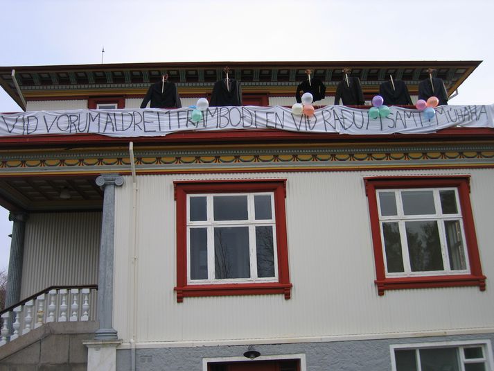 Verkalýðssamtök útrásarvíkinga á svölum Fríkirkjuvegar 11 25. apríl 2009 10:43 Sviðakjammar á stöng á svölum Fríkirkjuvegar 11. Hópur sem kallar sig Verkalýðssamtök útrásarvíkinganna hefur sent frá sér tilkynningu og boðar kynningu á stefnumálum sínum á svölum Fríkirkjuvegar 11 í Reykjavík fyrir hádegi í dag. Húsið er sem kunnugt er í eigu þeirra Björgólfsfeðga en svo virðist sem samtökin hafi komið nokkurskonar brúðum fyrir á svölum hússins.Í tilkynningunni kemur fram að blöðrur og pylsur verði í boði fyrir börnin. Mest lesið Sextán ára fékk greitt fyrir að færa Epstein stúlkur Erlent Milljónir til almannatengla og átta sinnum meira en í fyrra Innlent Systir og amma drengs í meðferð létust í Suður-Afríku Innlent „En hver sagði að þetta ætti að vera auðvelt?“ Innlent Ljósmyndir horfnar úr Epstein-skjölunum, þar á meðal ein af Trump Erlent Eyjólfur í orlof og Inga þrefaldur ráðherra Innlent Grunuð um að koma til landsins til að brjóta á öldruðum Innlent Sex hundruð miðar á vettvangi morðsins: „Fokking hálfvita fífl bæði tvö!!!!“ Innlent „Við erum pottþétt að koma út í mínus, hversu miklum vitum við ekki“ Innlent Bindur vonir við Vor til vinstri Innlent Fleiri fréttir „Þetta er bara ljótt“ Hljóti að vera komið að því að skoða öryggisgæslu við skóla Ætlar að skýra hvenær rjúfa megi þagnarskyldu Þagnarskylda heilbrigðisstarfsfólks og öryggisgæsla við grunnskóla Eyjólfur í orlof og Inga þrefaldur ráðherra Vegagerðin segir flóðin í Vík fyrirséð Fjölmiðlar, bókmenntir og hægrimennska á Sprengisandi „En hver sagði að þetta ætti að vera auðvelt?“ Milljónir til almannatengla og átta sinnum meira en í fyrra Grunuð um að koma til landsins til að brjóta á öldruðum Leggja hald á skip á alþjóðahafsvæði undan ströndum Venesúela Bindur vonir við Vor til vinstri Systir og amma drengs í meðferð létust í Suður-Afríku „Við erum pottþétt að koma út í mínus, hversu miklum vitum við ekki“ „Þetta er alveg ásættanlegur samningur“ Deildi nöfnum skjólstæðinga á Instagram Íslendingar þægileg fórnarlömb fyrir vasaþjófa „Að öllu óbreyttu mun þjóðvegurinn fara í sundur“ Vonbrigði í Vík og rýnt í Epstein-skjölin Morgundagurinn sá stysti á árinu Langtímaleigan 23 þúsund krónum dýrari á ári Grenjandi rigning og hífandi rok á aðfangadag Reyndi að komast inn á lögreglustöð með fíkniefni Svona á að raða í uppþvottavélina „Verður vonandi til að styrkja íslensku einkareknu miðlana“ Talinn hafa komið til landsins til að stela Snorkstelpan snýr aftur eftir ágreining um höfundarrétt Framlög til einkarekinna fjölmiðla næstum tvöfaldast Meðferð við spilafíkn loks niðurgreidd af Sjúkratryggingum Kílómetragjaldið bitni helst á sparneytnum eldsneytisbílum Sjá meira