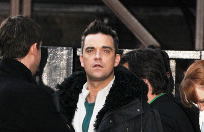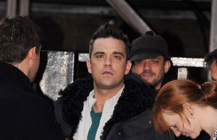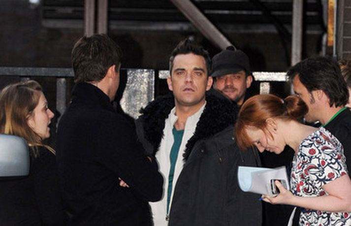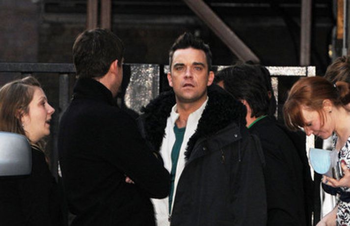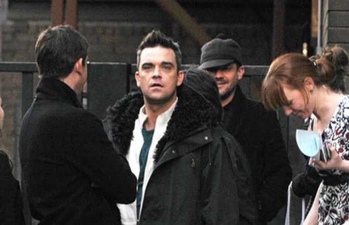 Breski söngvarinn var umvafinn félögum sínum fyrir utan upptökuver í London. „Það er ekkert vit í að sjá eftir hlutum. Lífið er of stutt til að hafa áhyggjur af einhverju sem þú sagðir eða gerðir," sagði Robbie.Eins og myndirnar sýna var Robbie pirraður þegar hann kom auga á ljósmyndarana sem mynduðu hann.