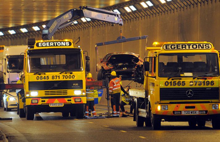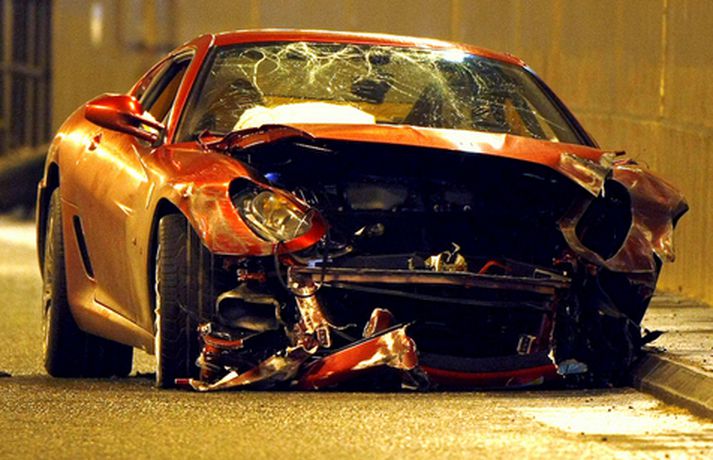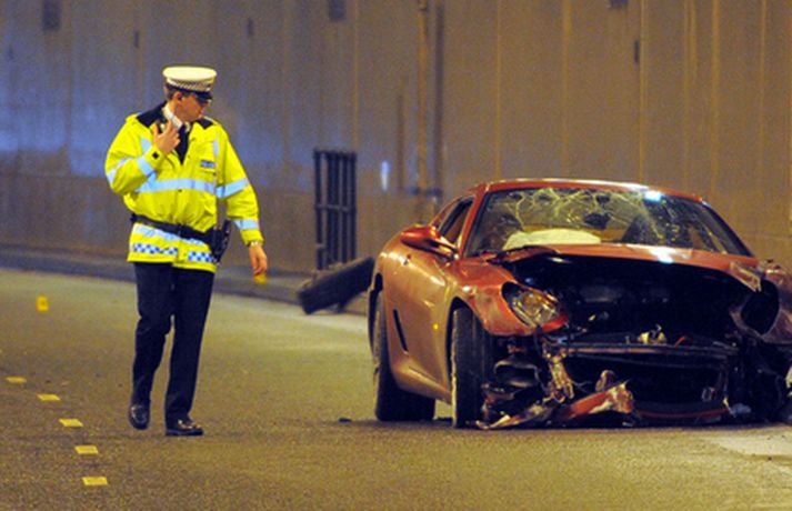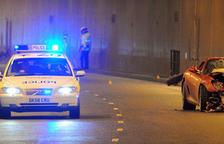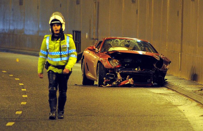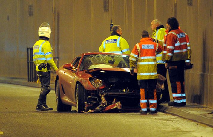 Cristiano Ronaldo eyðilagði Ferrari-bifreið sína er hann ók á vegarstólpa í göngum rétt utan við Manchester-borg í dag. Eins og sést á meðfylgjandi myndum neðst í greininni er bíllinn gerónýtur. En til allrar lukku slapp Ronaldo heill frá öllu saman og æfði með Manchester United í dag eins og venjulega. Lögreglan hefur auglýst eftir vitnum til að varpa ljósi á hvað nákvæmlega gerðist en engir aðrir bílar lentu í árekstrinum. Félagi Ronaldo hjá United, markvörðurinn Edwin van der Sar, var skammt undan í Bentley-bifreið sinni. Við áreksturinn fór eitt dekkið undan bílnum og hafnaði um tvö hundruð metra frá þeim stað sem bíllinn staðnæmdist. Jody Lomax varð vitni að árekstrinum. „Ferrari-inn klessti beint á vegginn, fremsta vinstra dekkið fór undan bílnum og Ronaldo steig úr honum." „Ég var nú sjálf í sjokki. En það var allt í lagi með hann þó hann væri eðlilega nokkuð skelkaður. Það var líka synd að sjá bílinn fara svona," sagði hún. Lögreglan sagði enn fremur að Ronaldo hefði verið látinn blása í áfengismæli en að ekkert óeðlilegt hafi komið fram þar. Samkvæmt þessu er því ekkert því til fyrirstöðu að Ronaldo geti leikið með sínum mönnum gegn Chelsea á sunnudaginn.Lögreglan var ekki lengi að koma á vettvang.Nordic Photos / AFPLögregluþjónn skoðar klessukeyrða Ferrari-inn.Nordic Photos / AFPÞetta eru göngin sem Ronaldo var að keyra í.Nordic Photos / AFPSem betur fer slasaðist enginn.Nordic Photos / AFPKranabílar mættu á vettvang.Nordic Photos / AFPNordic Photos / AFPVonandi var Ronaldo með fákinn í Kaskó.Nordic Photos / AFPUpp fer bílinn ...Nordic Photos / AFP... og burt.Nordic Photos / AFP
